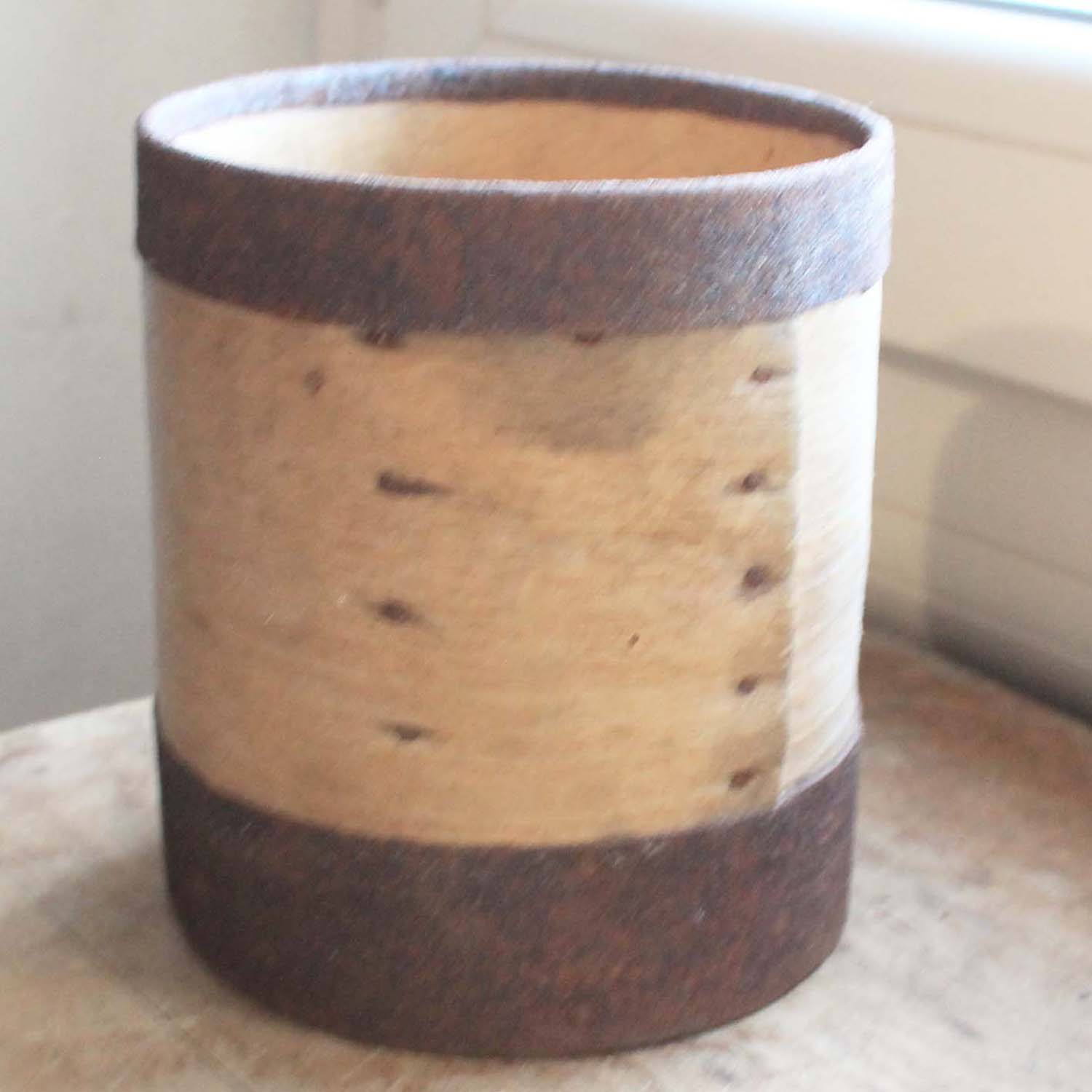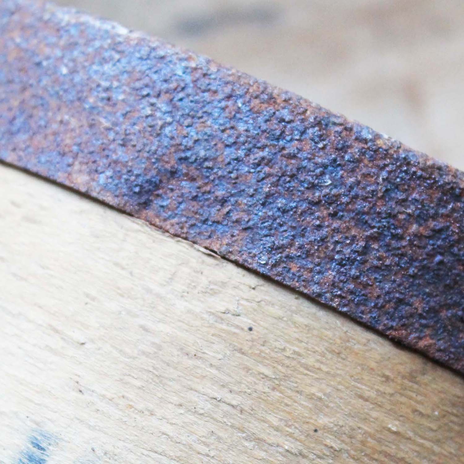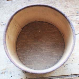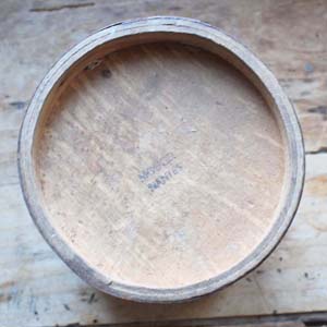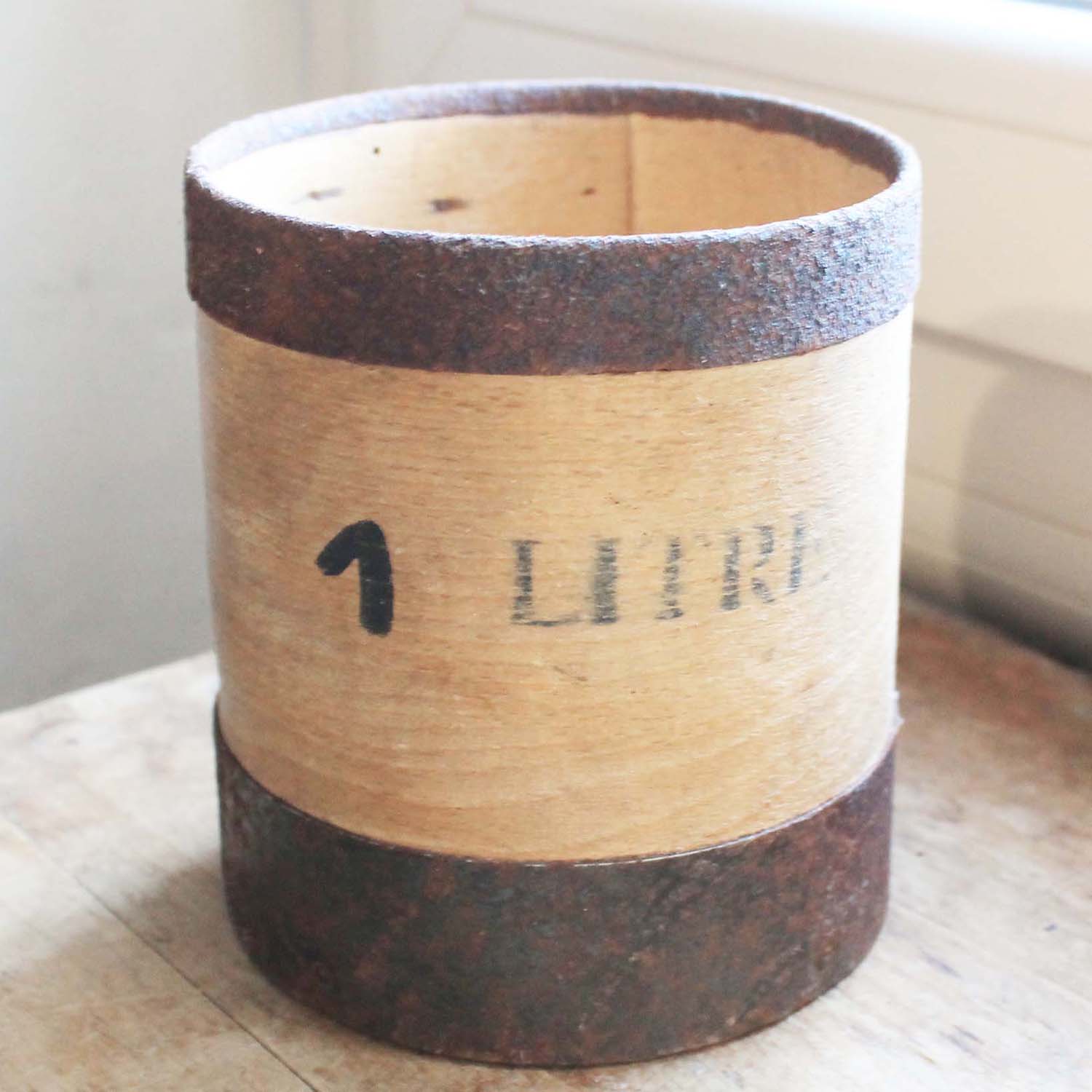 古い木製のメジャー。粉や種などを計るものです。1L になります。1の部分があとから書き足してあります。またバンドの鉄の部分にさびがあります。