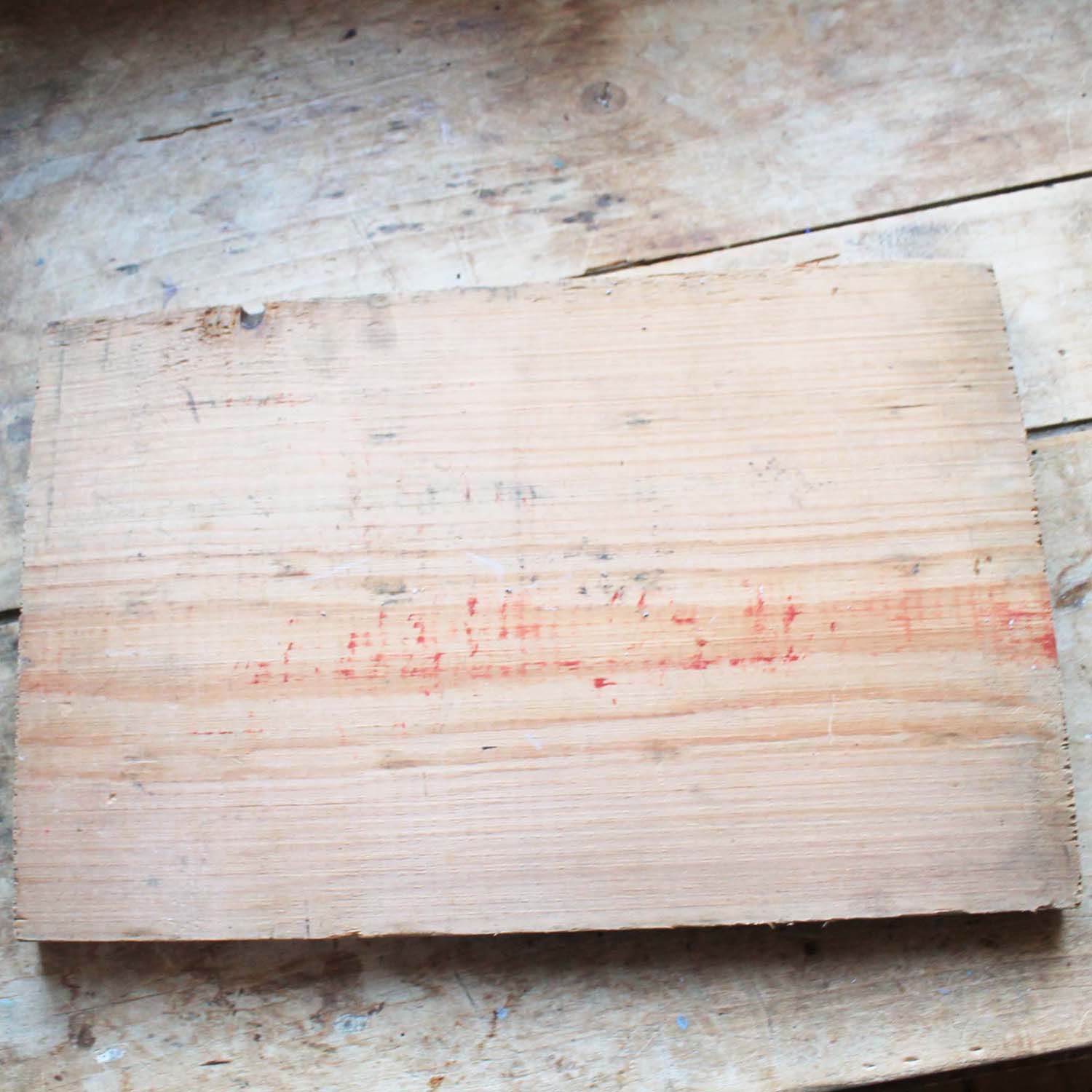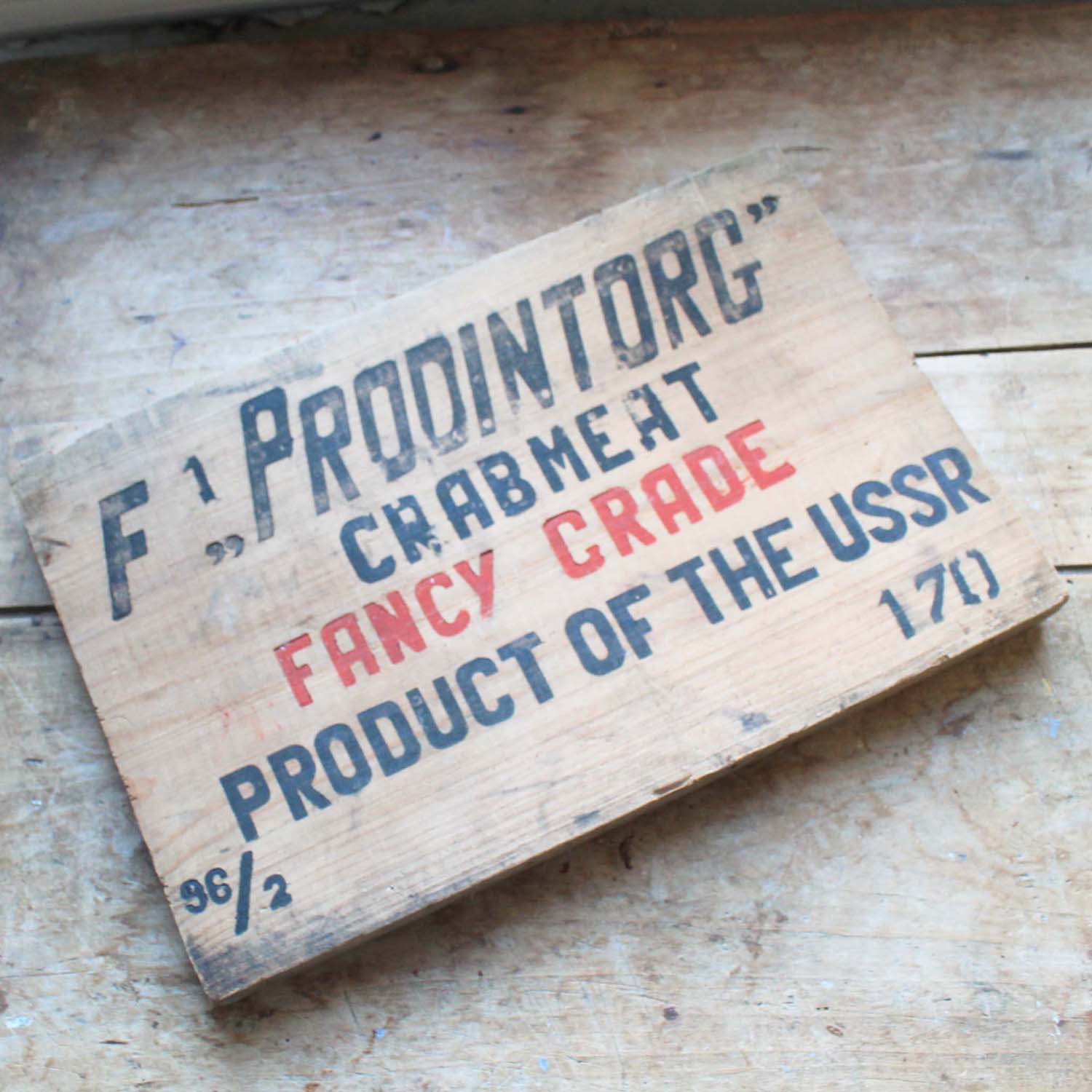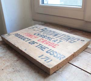 今はない旧ソ連時代の木箱の蓋。カニ肉の輸出用の木箱の物だったともいます。古い物なので多少の傷、汚れがあります。
