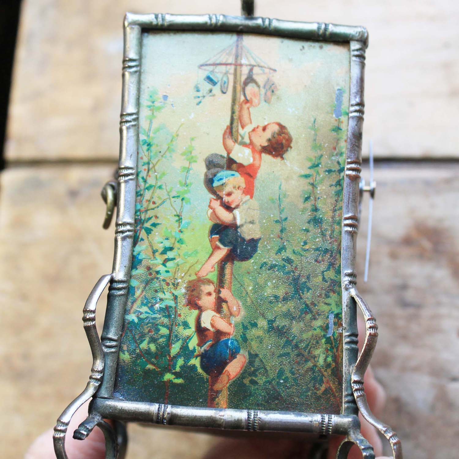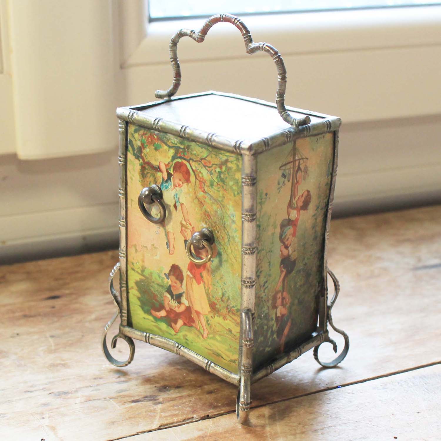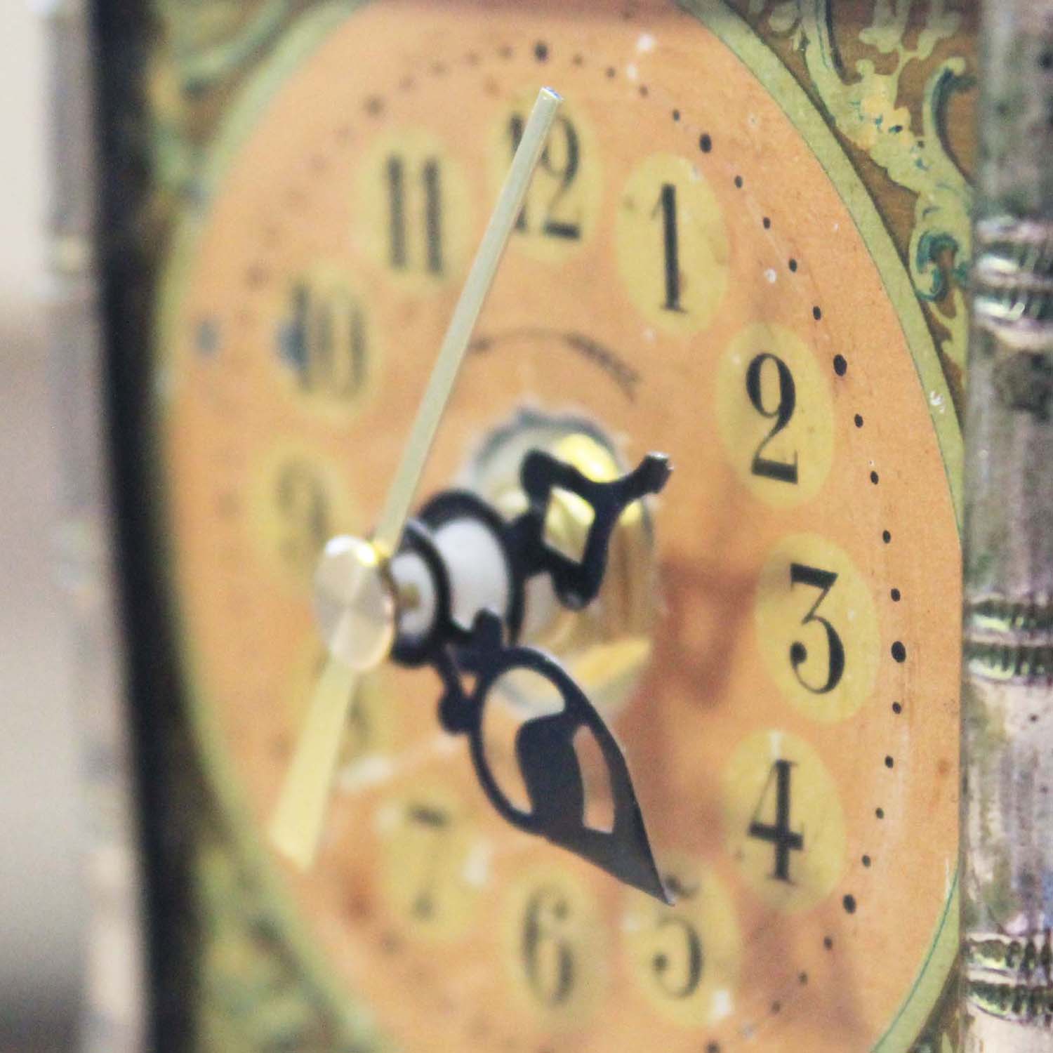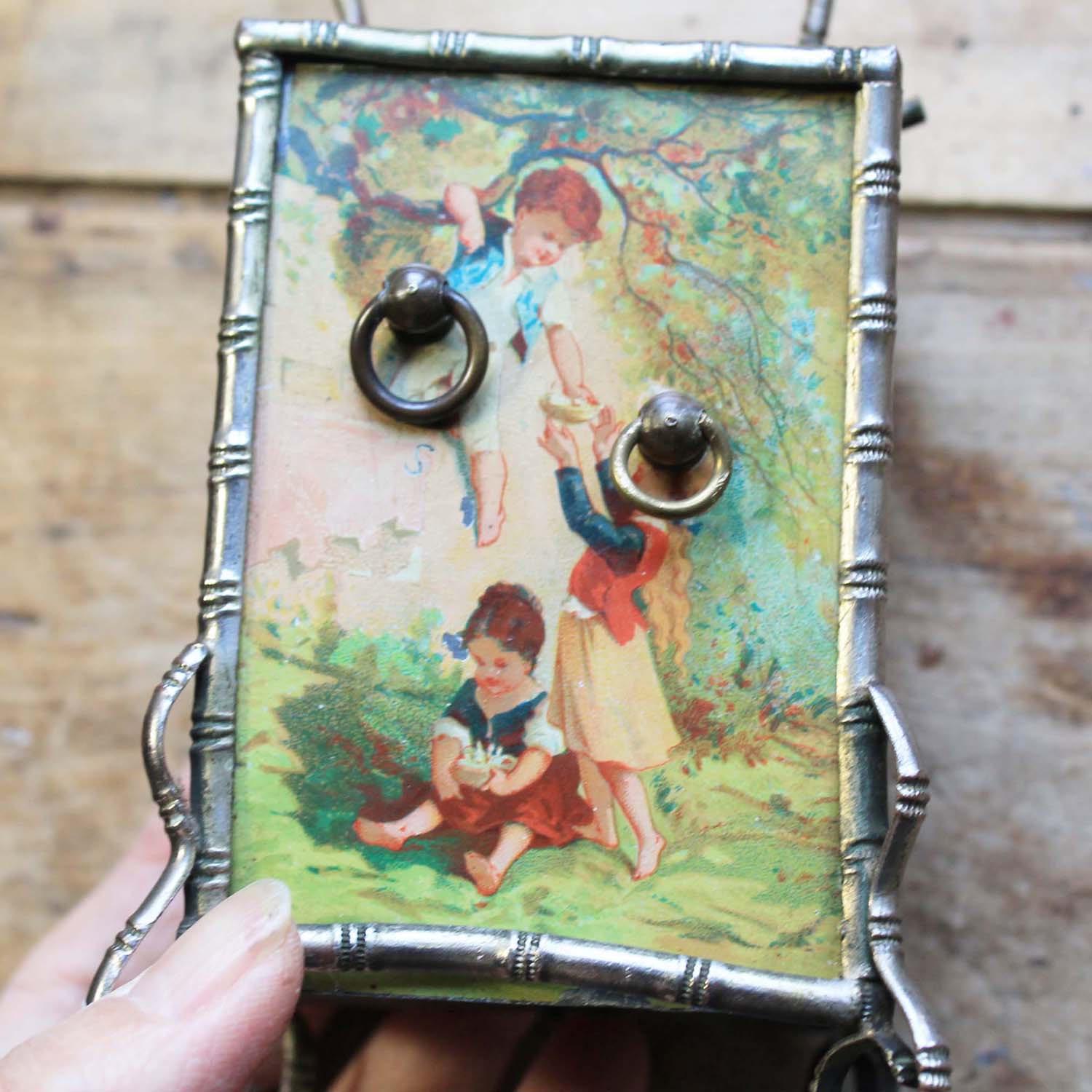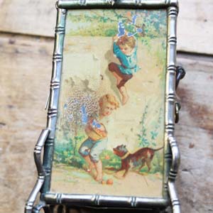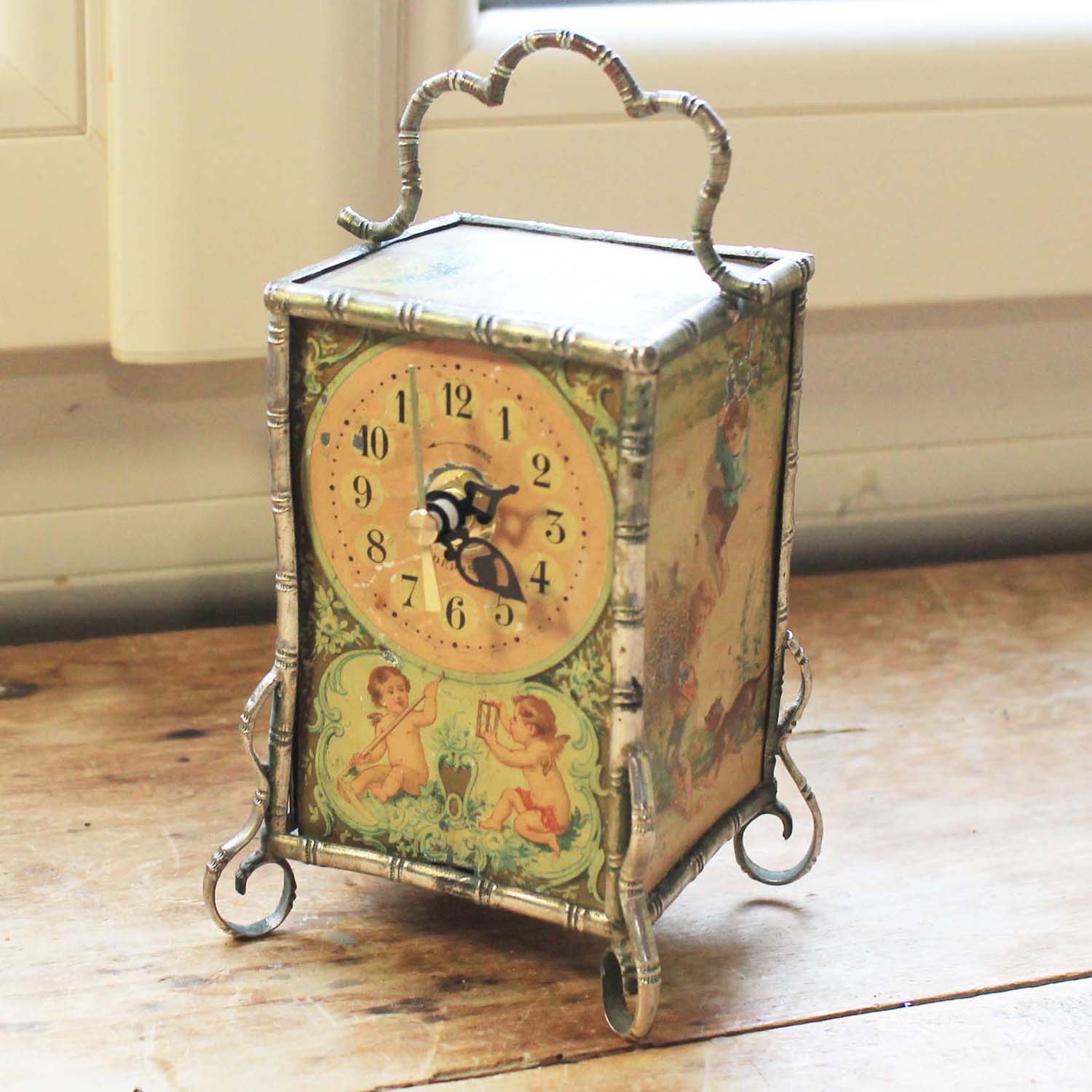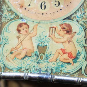 100年ぐらい前の古い置時計。エンジェルの絵柄がかわいいです。 淵の枠はバンブースタイルになるので、ルイフィリップあたりのものではないかと思います。中の時計部分は電池式のものに変えてありますが、古いものなので多少遅れ気味です。また、傷、汚れ、ペイントの葉枯れがあります。