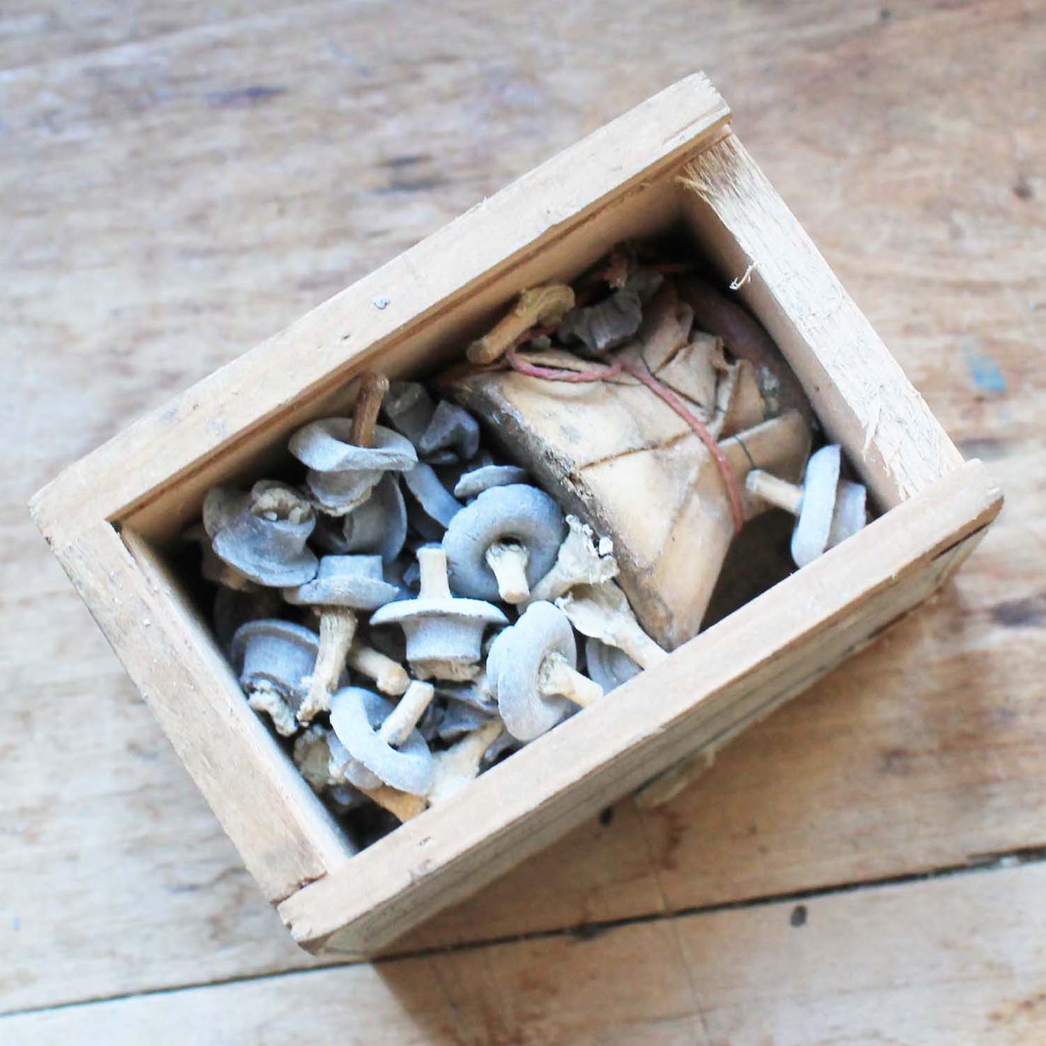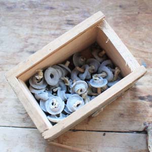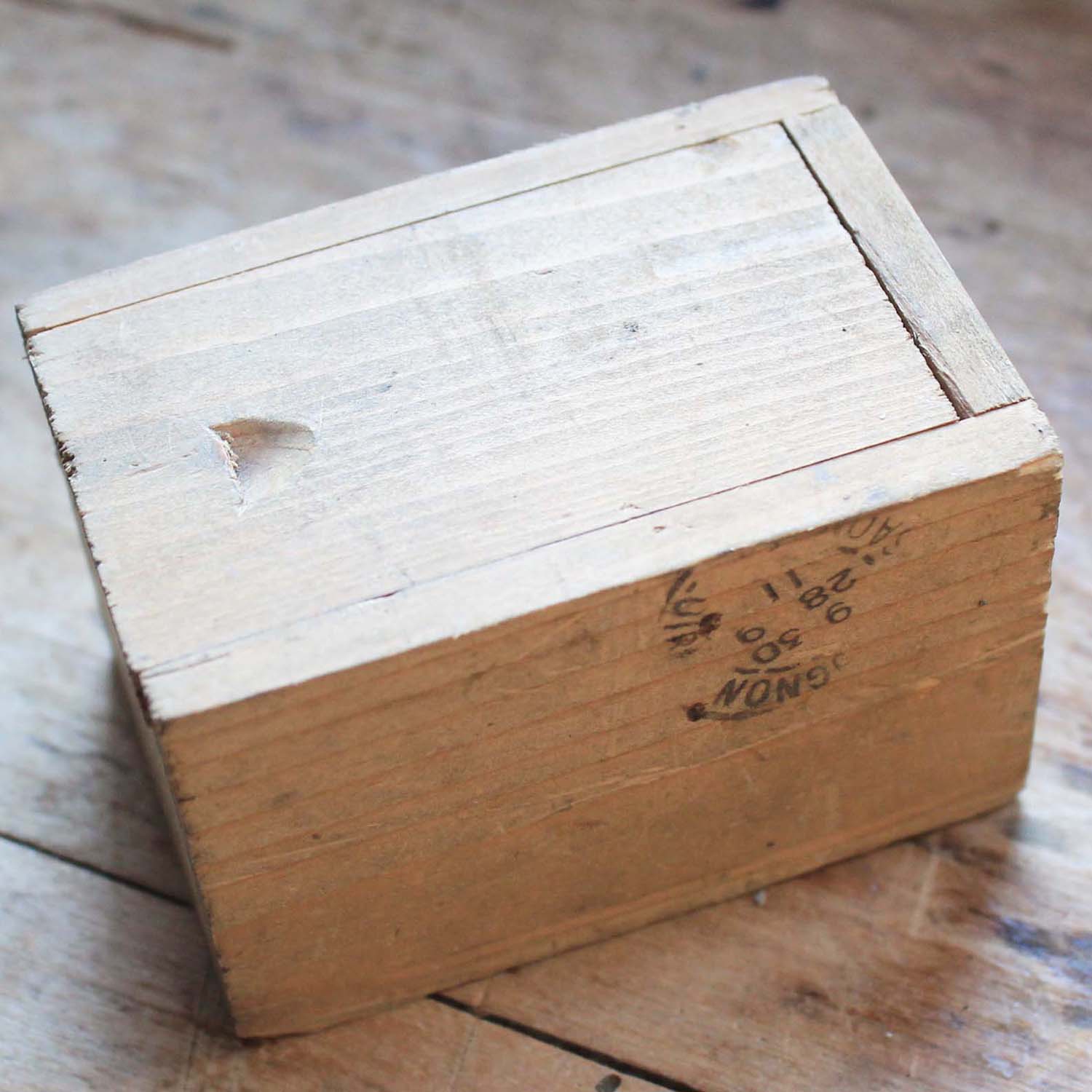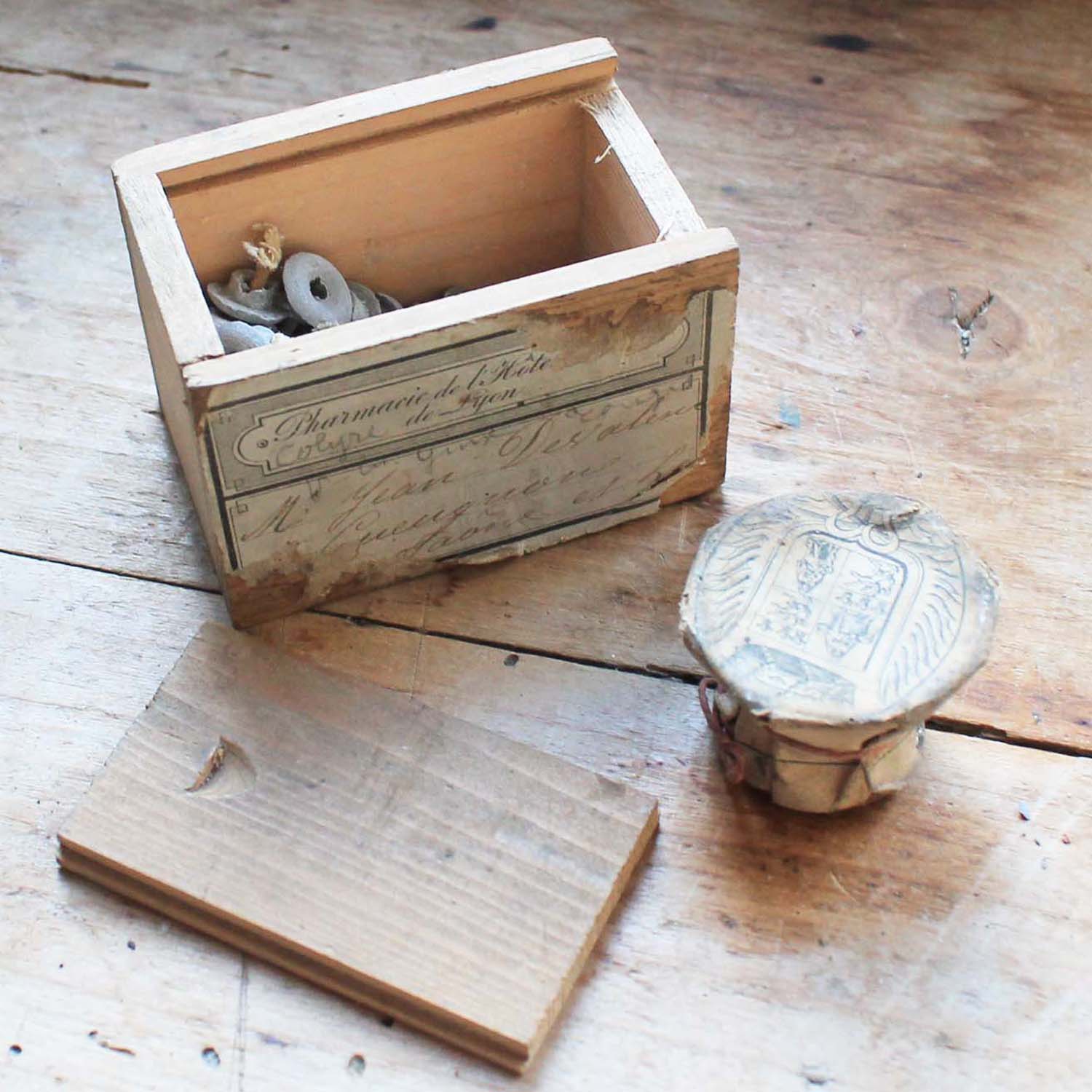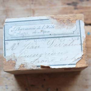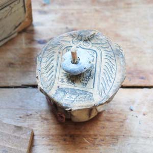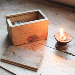 古い木製の箱に、携帯用ろうそくとろうそく用のスタンド(テラコッタ製)がついています。 スタンドは一度も使われていなく包装紙がまだついています。箱は郵便の箱で切手もまだついています。古いものなのでろうそくにダメージが入っているものがあります。