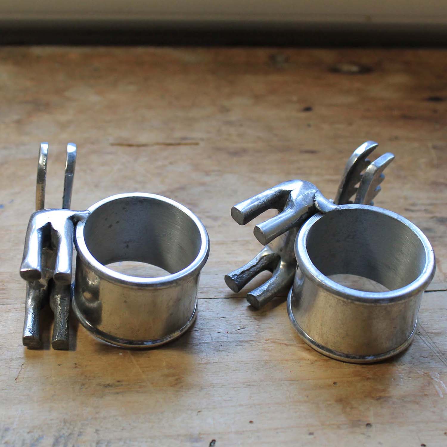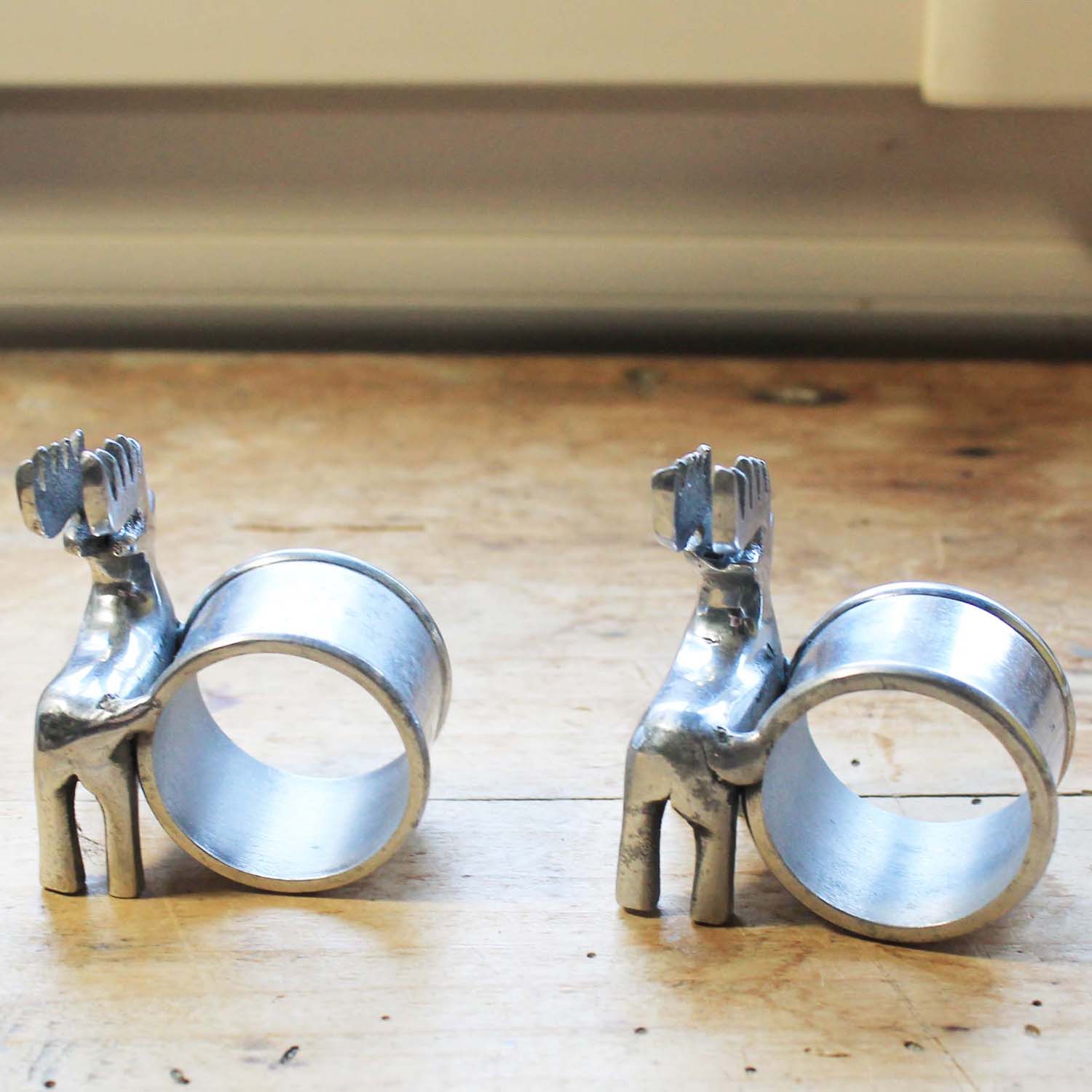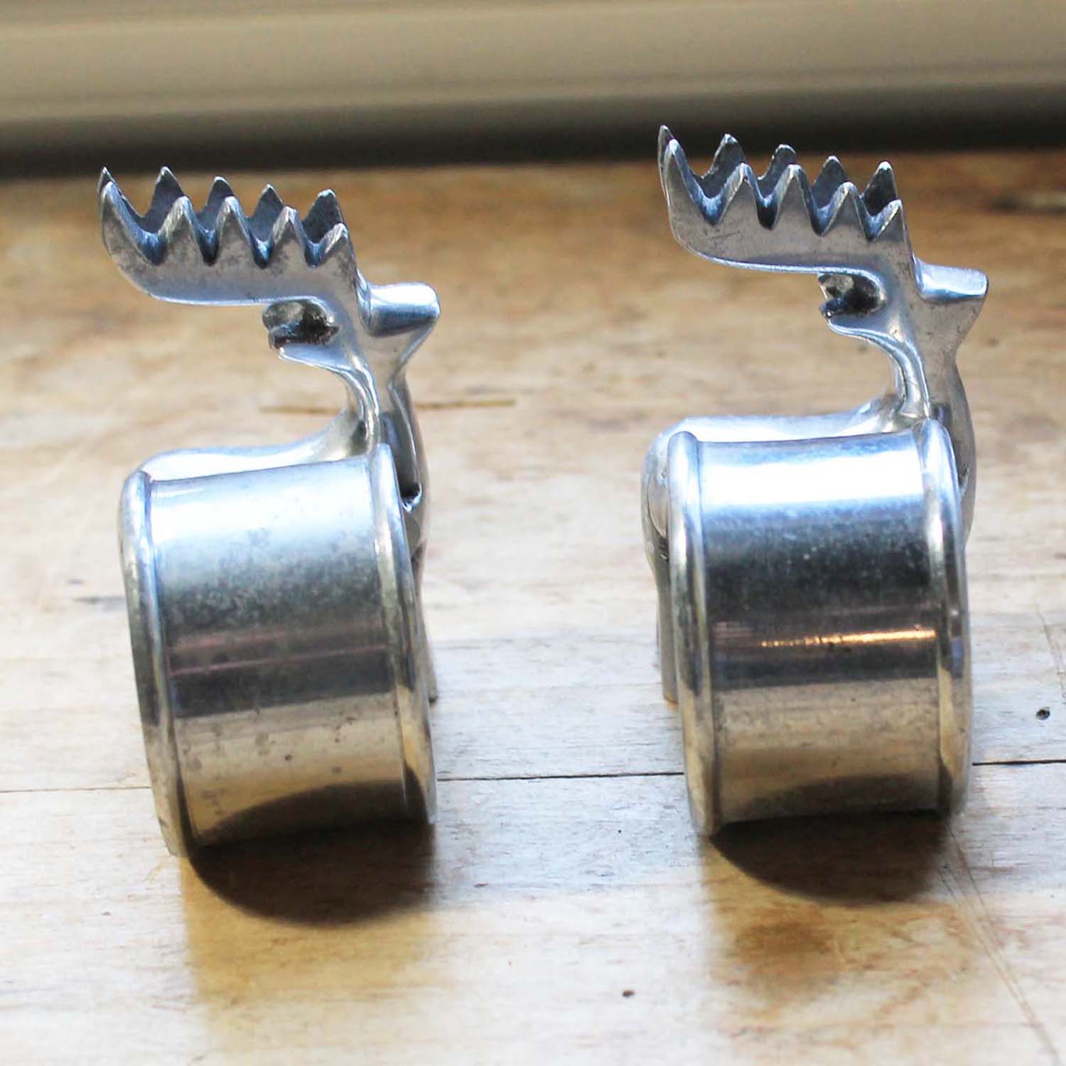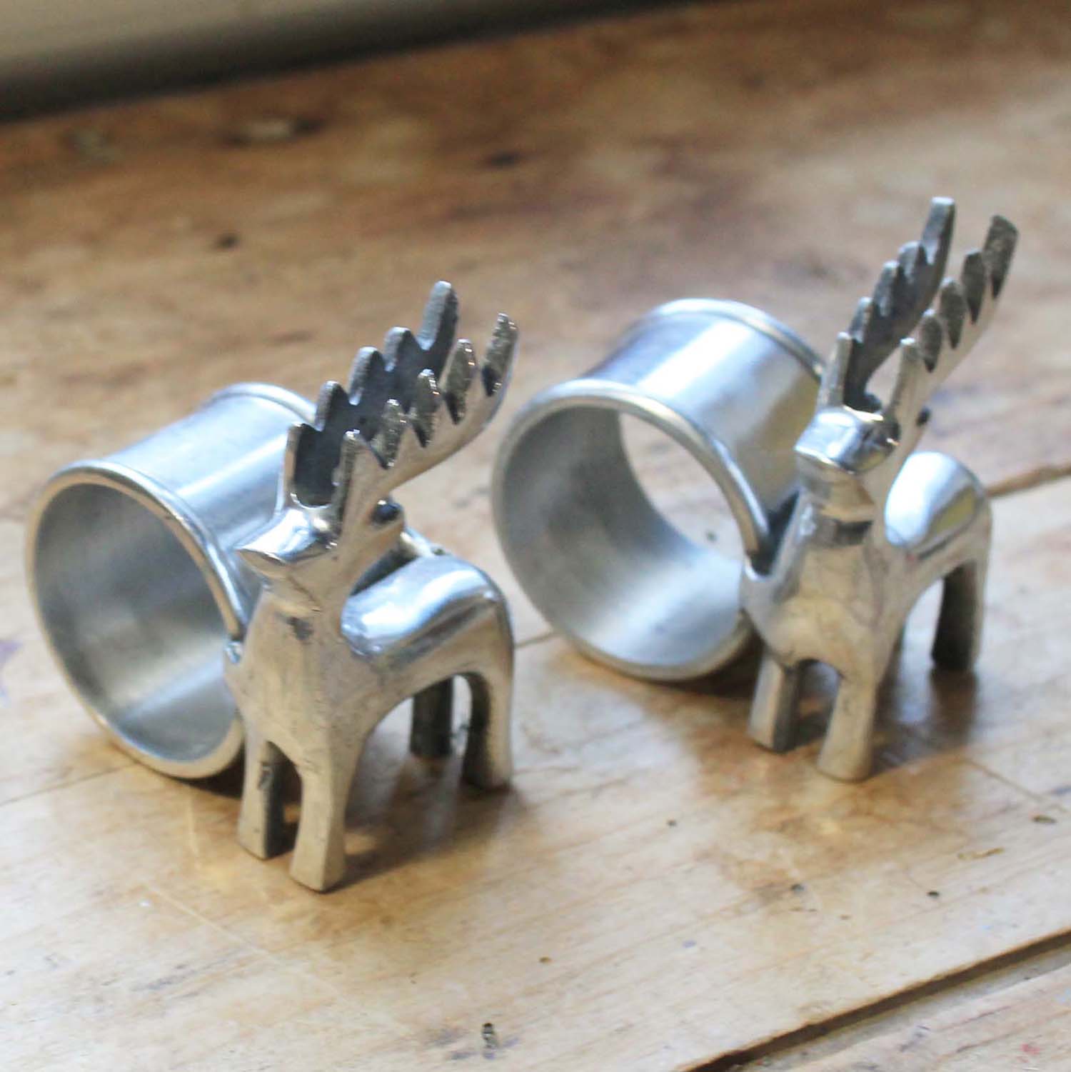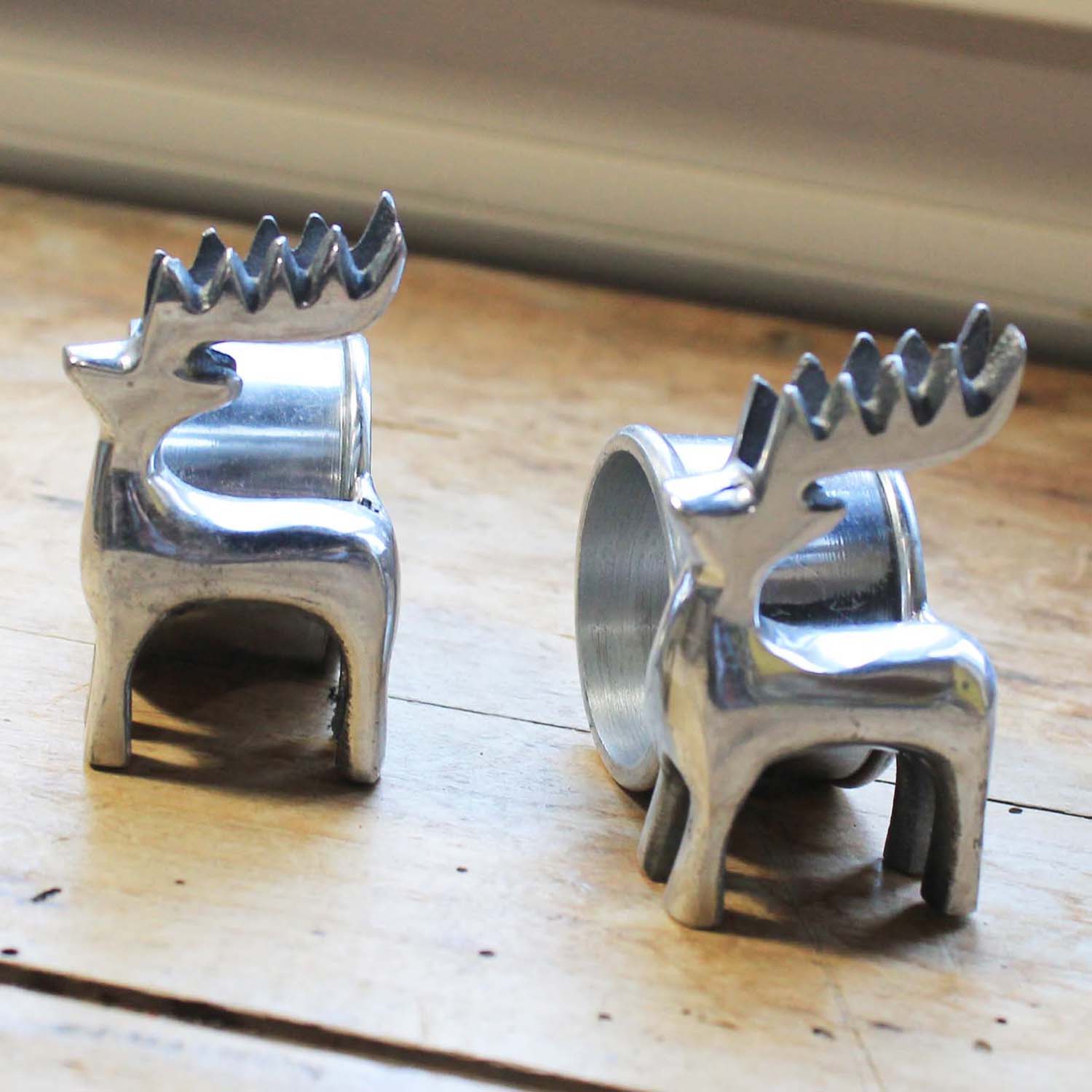 古い金属製のナプキンリング。 トナカイの形がかわいいです。2つセットになります。古いものなので多少の傷、汚れがあります。