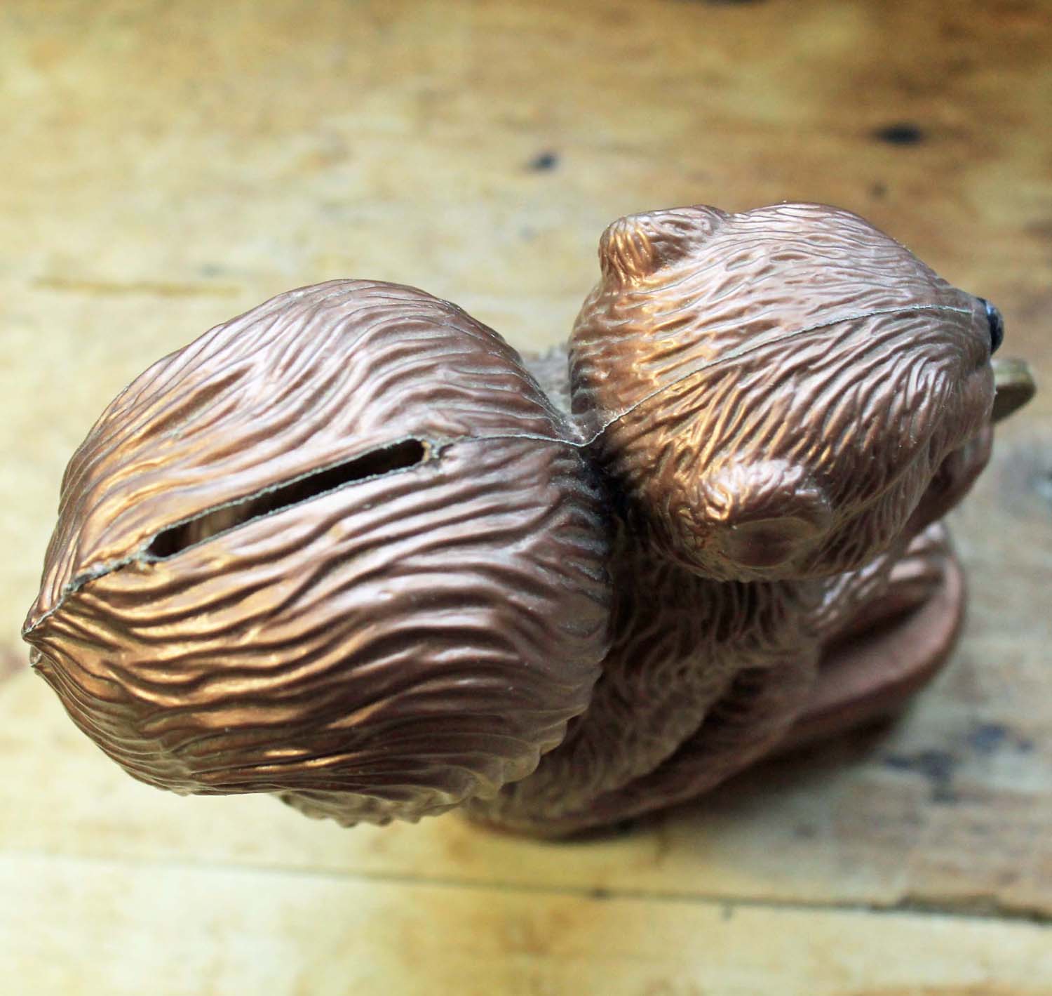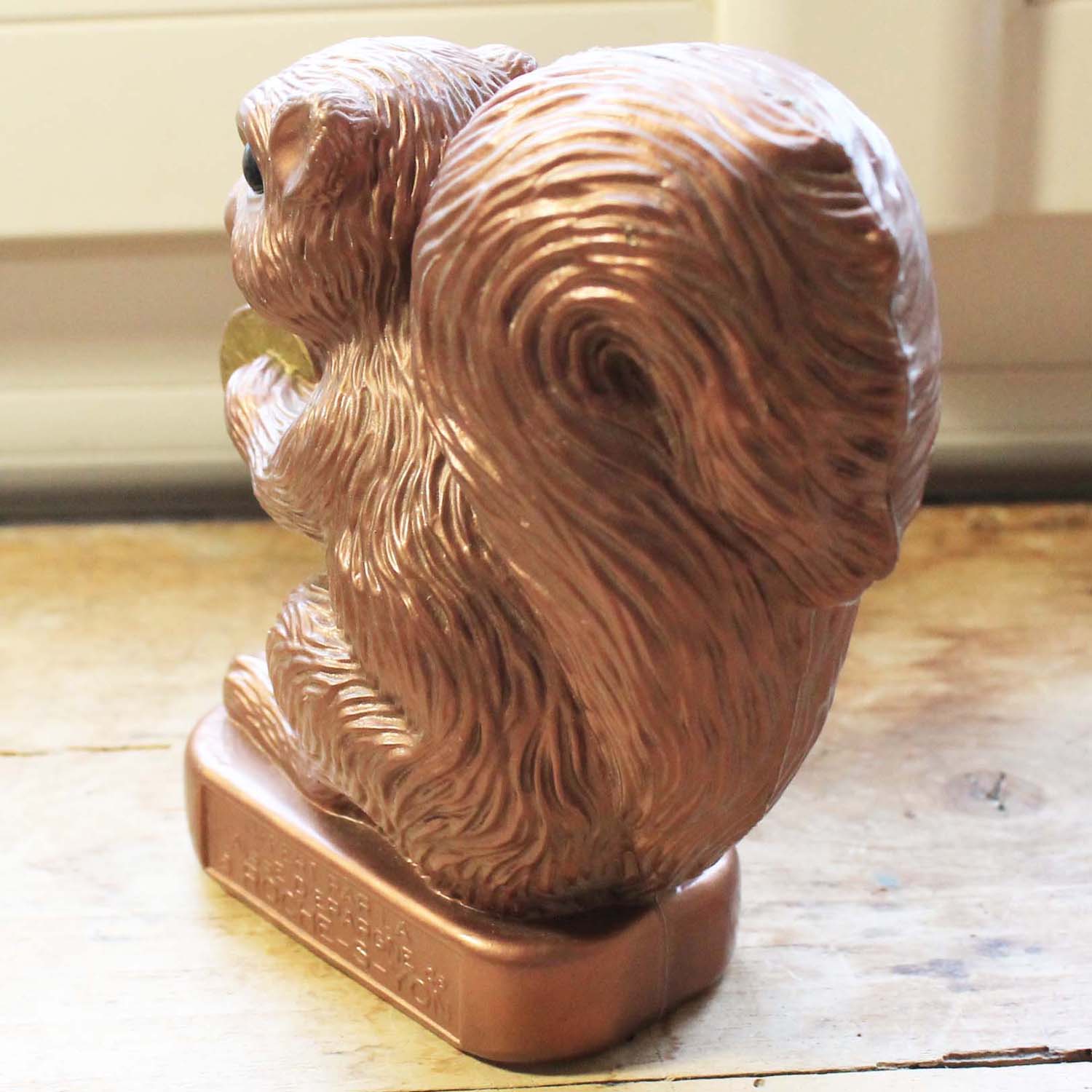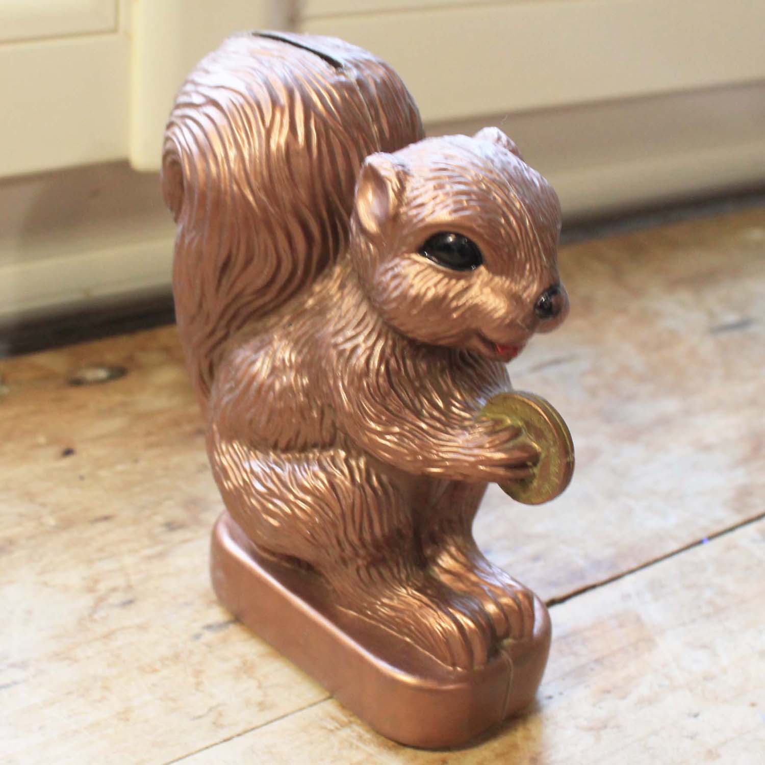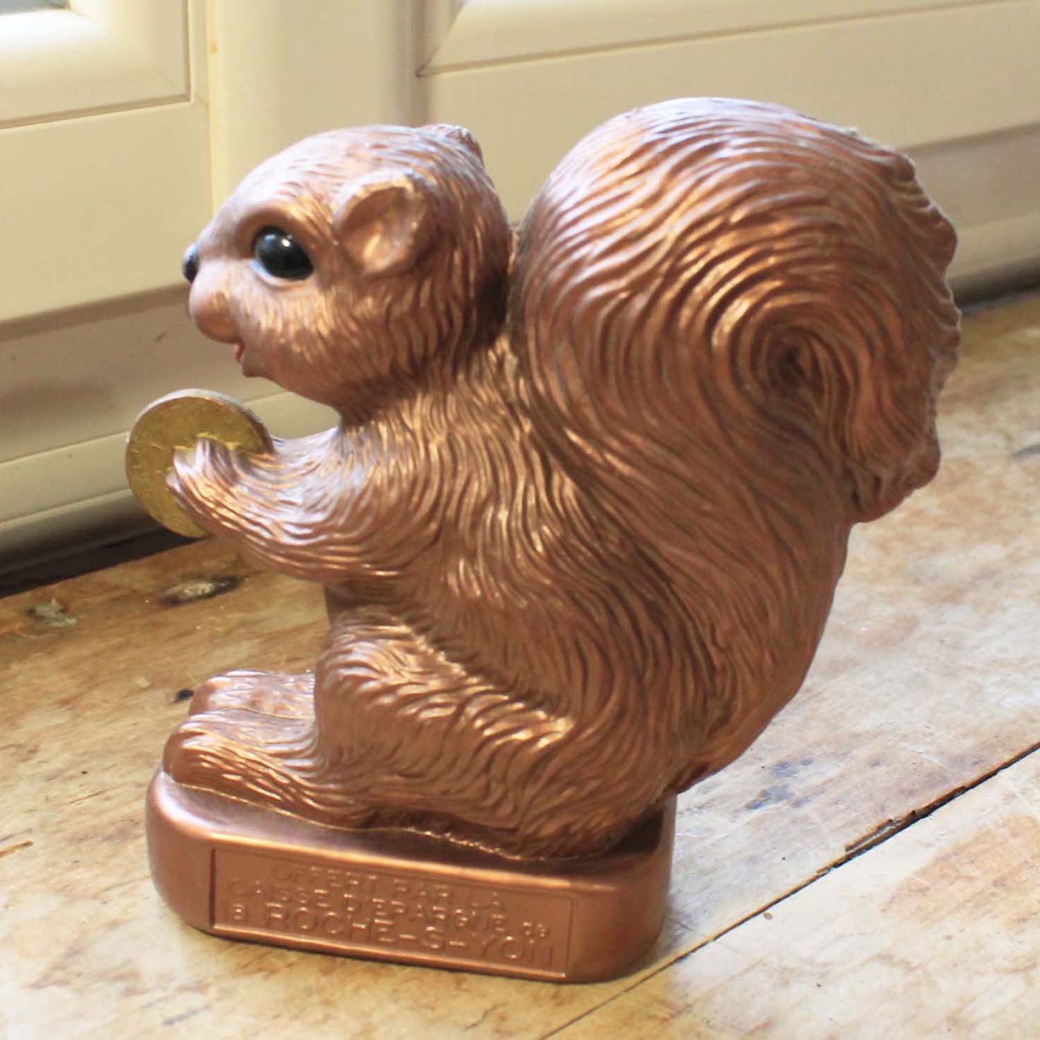 1970年代ぐらいの古いプラスティック製の貯金箱。フランスの銀行Caisse D'Epagneのノベルティです。珍しいのは支店の名前La Roche-S-Yonが入っています。 リスが持っているコインが昔のフレンチフランのコインです。古いものなので傷、汚れ、裏に割れがあります。