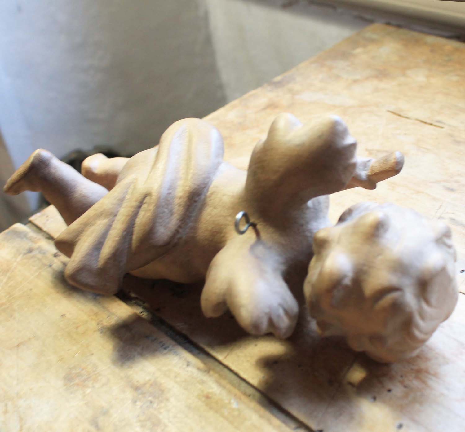 古い木製のエンジェル。 背中にフックがついていて天井からつるすタイプのものです。手彫りです。古いものなので多少の汚れがあります。