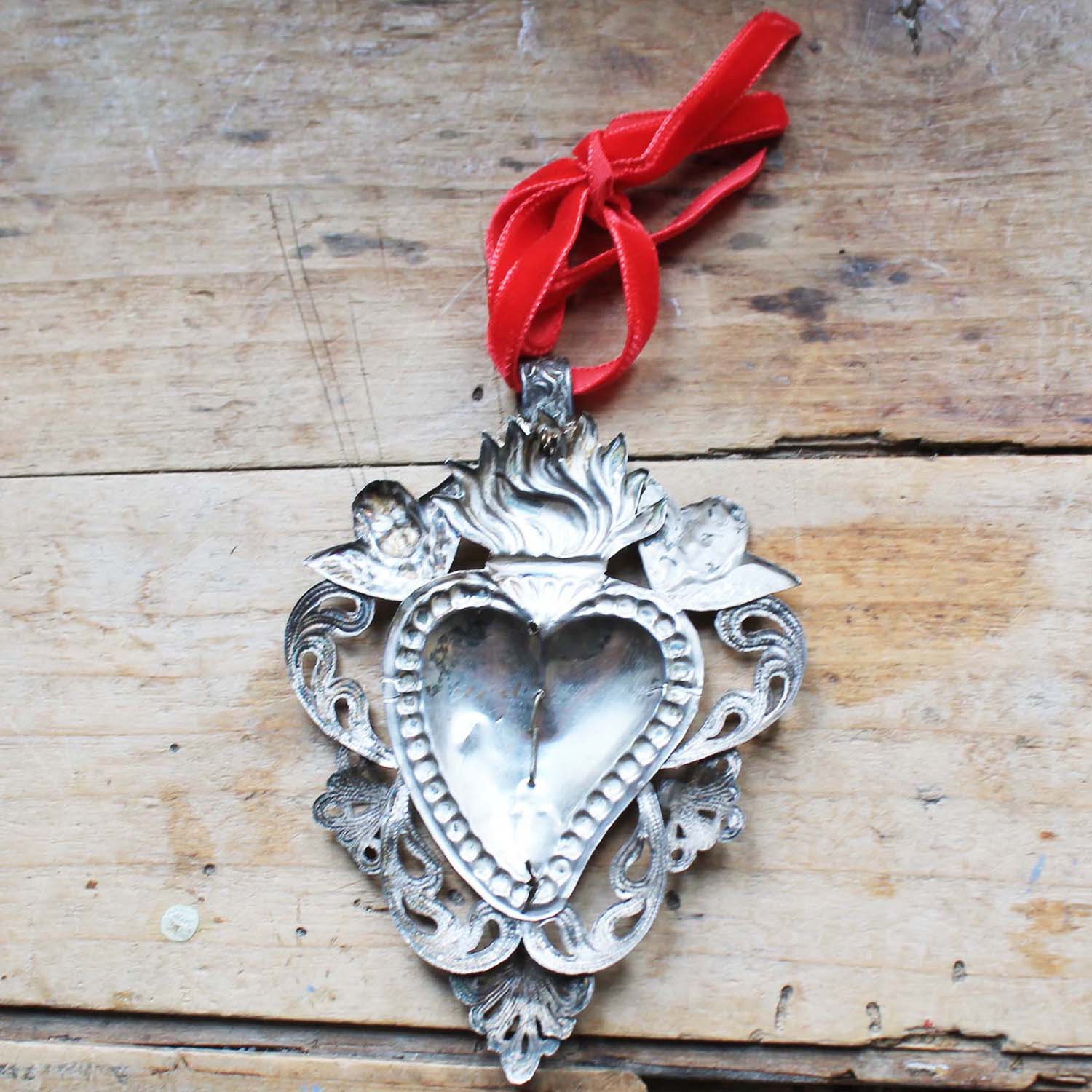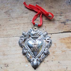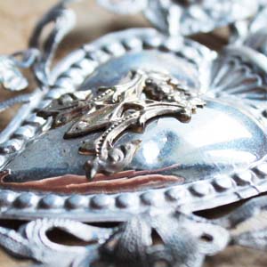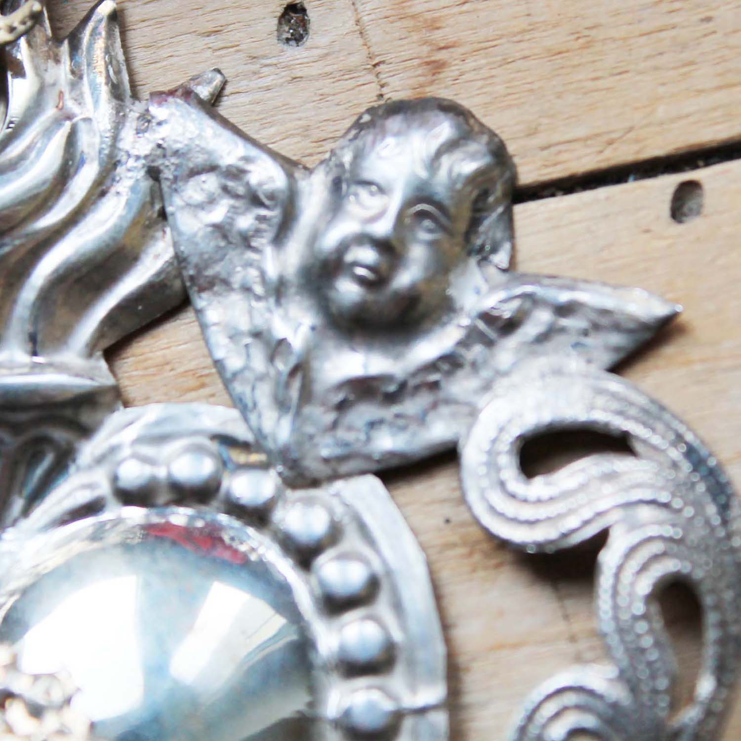 実際に教会の奉納されていた100年ぐらい前のEX VOTO。 M(マリア様)のイニシャル、エンジェルなどのモチーフが素敵です。純銀製になります。