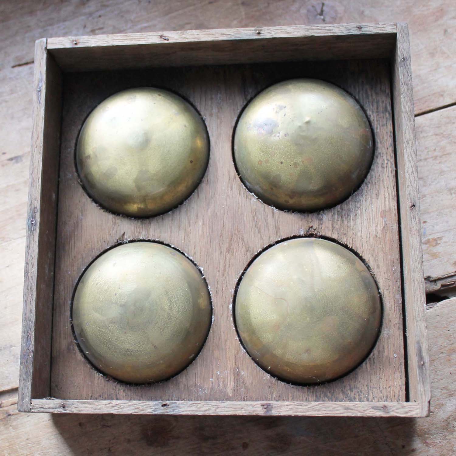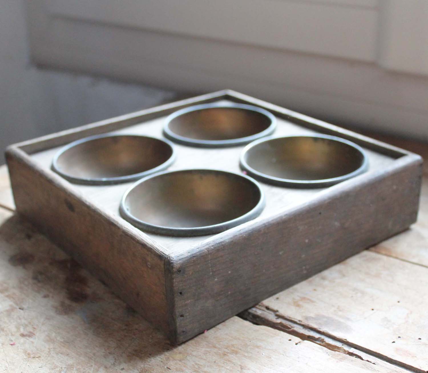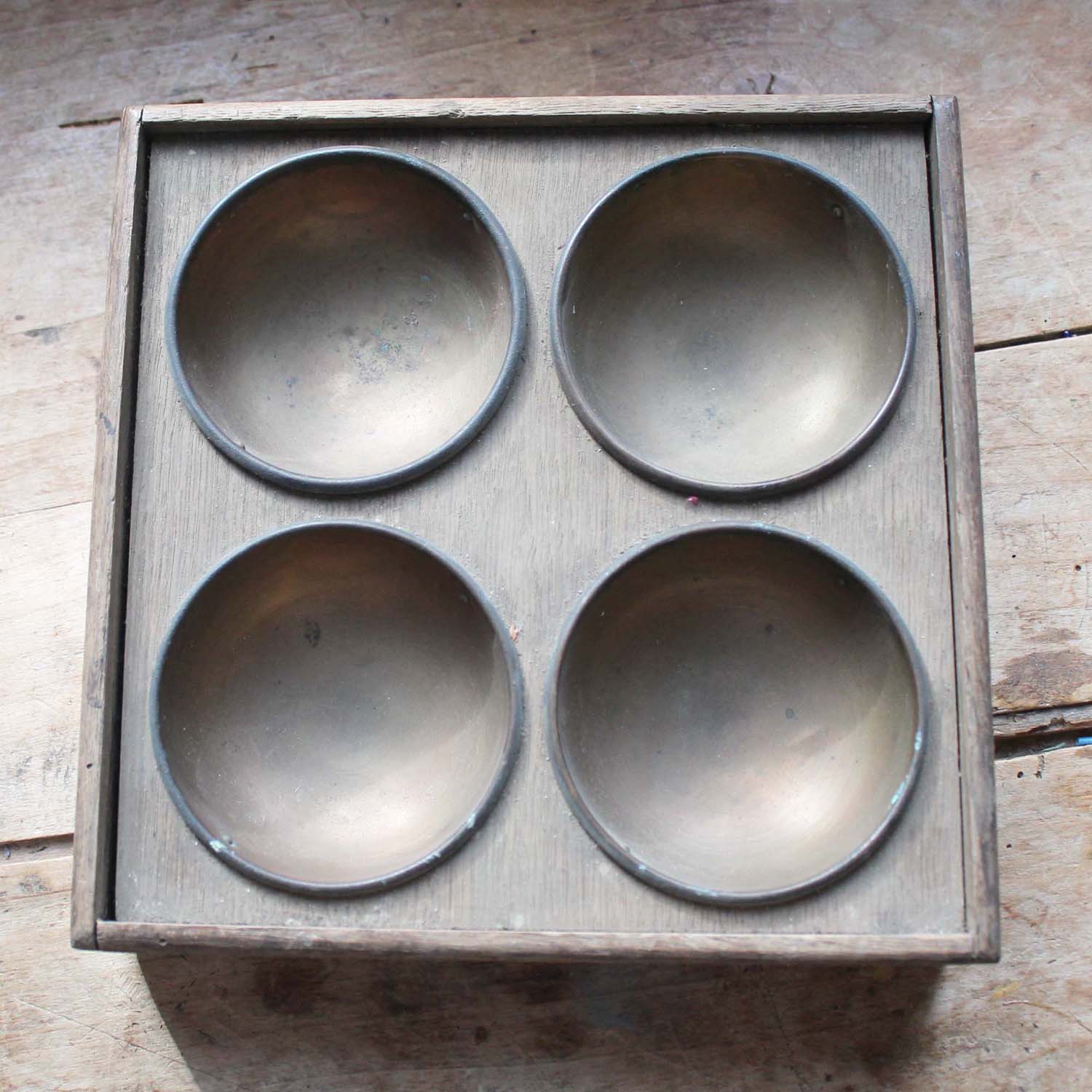 100年ぐらい前の古いマネートレイ。枠は木製、ボウル部分は金属製です。古いものなので、傷、汚れ、でこぼこ、さびがあります。