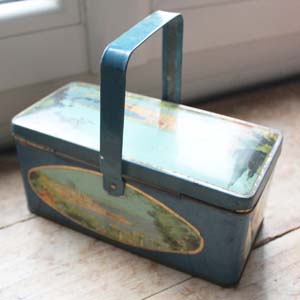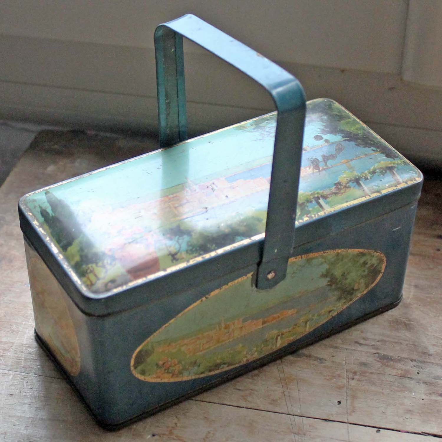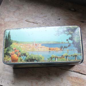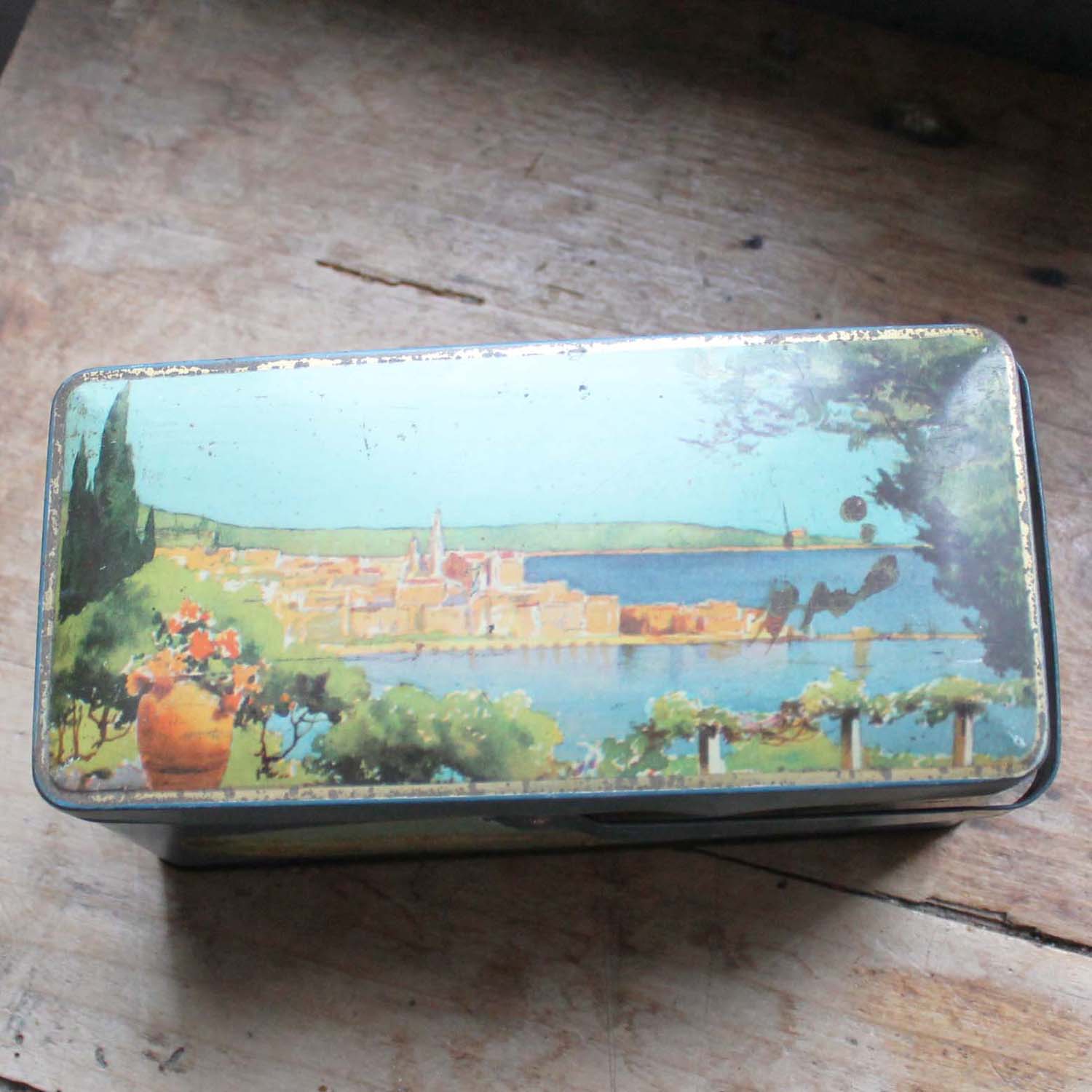 古いビスケット用の缶。 海辺の景色の絵柄です。古いものなので多少の傷、汚れがあります。