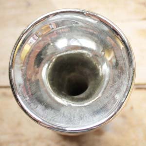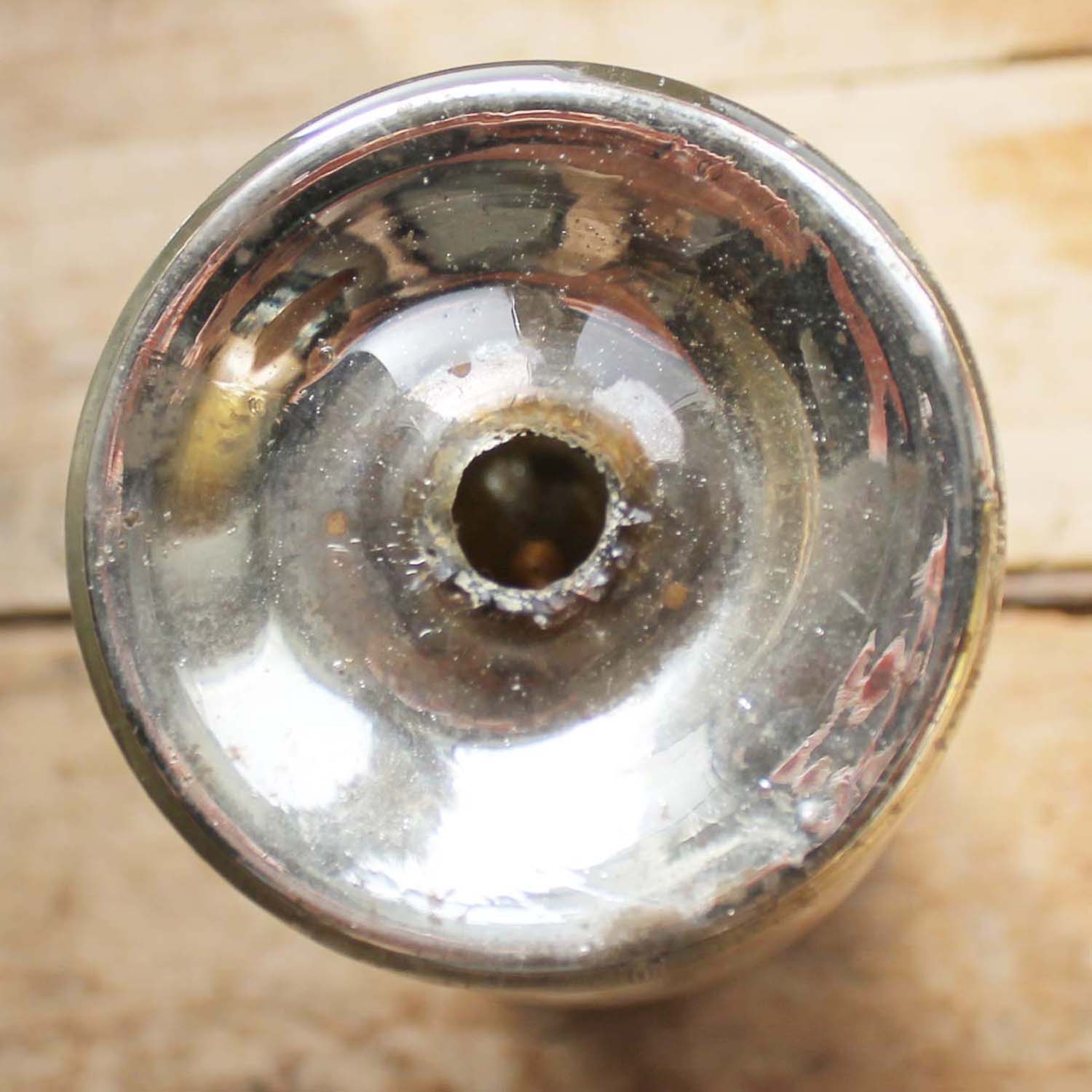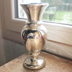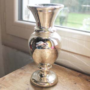 100年以上前に作られたマーキュリーグラスの花瓶。この花瓶は2重構造になっていて、2重構造の物は1850年代ぐらいから作られはじめ、短い期間で生産は終わってしまいました。この商品は19世紀初期辺りのものだそうです。 古いものなので、表に白いペイントで描かれた花柄はほとんど撮れてしまっていますが、欠け、ラインはありません。