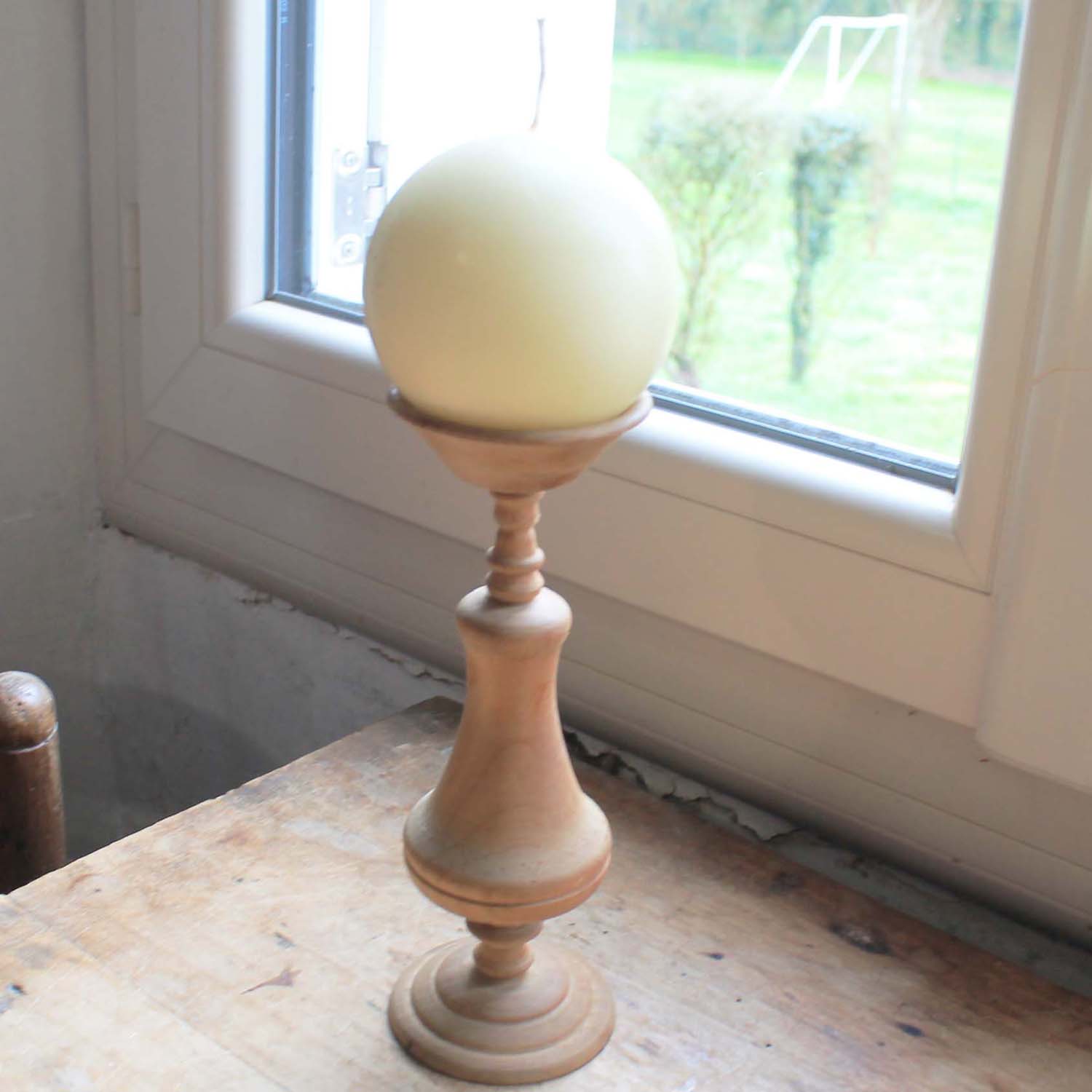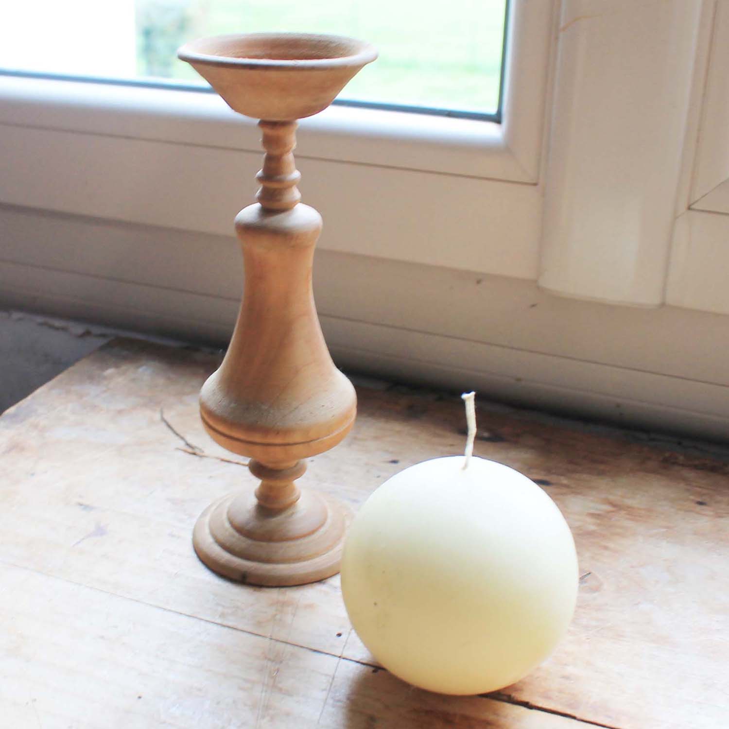1950年代前後の古い木製キャンドルスタンド。 キャンドル付きです。キャンドルスタンドに蝋の跡がありますが、ろうそくは使用された形跡はありません。