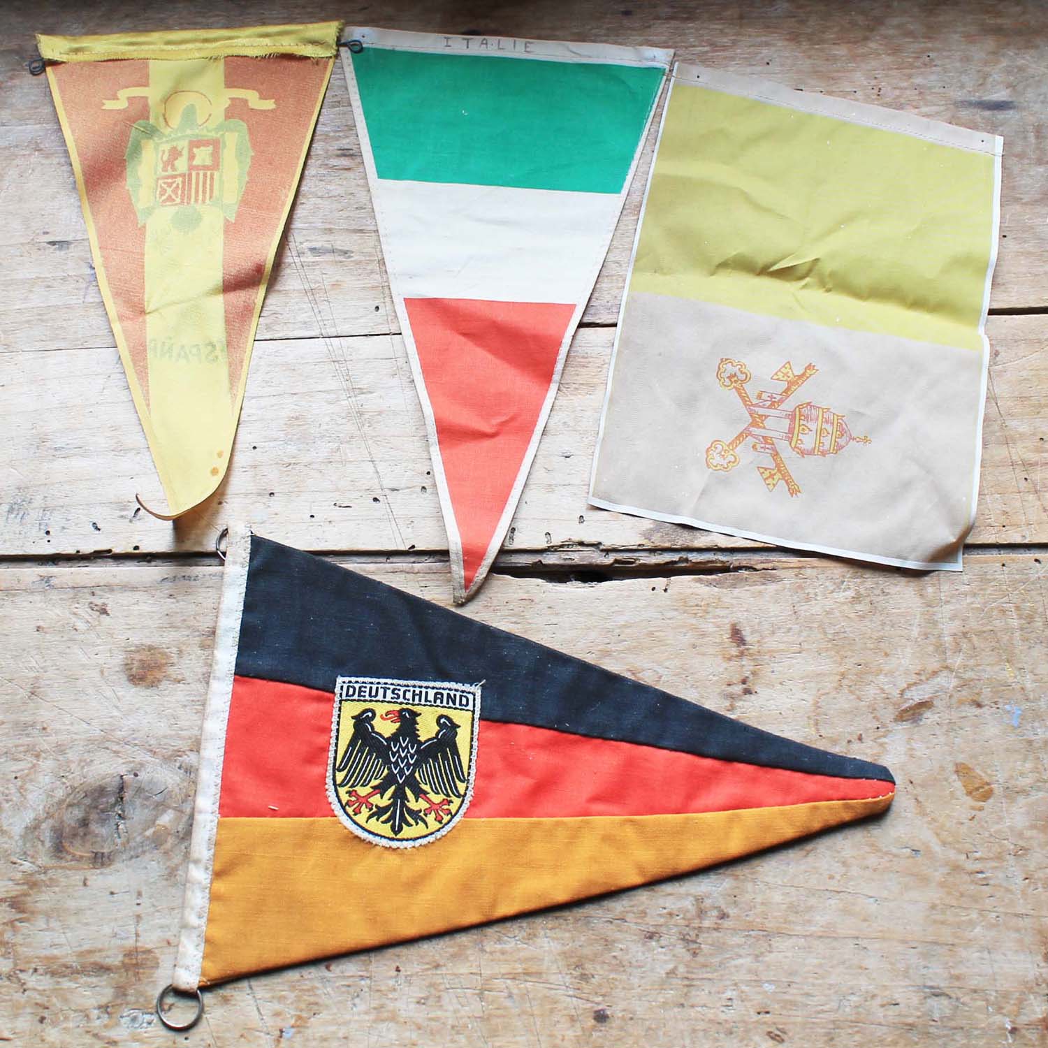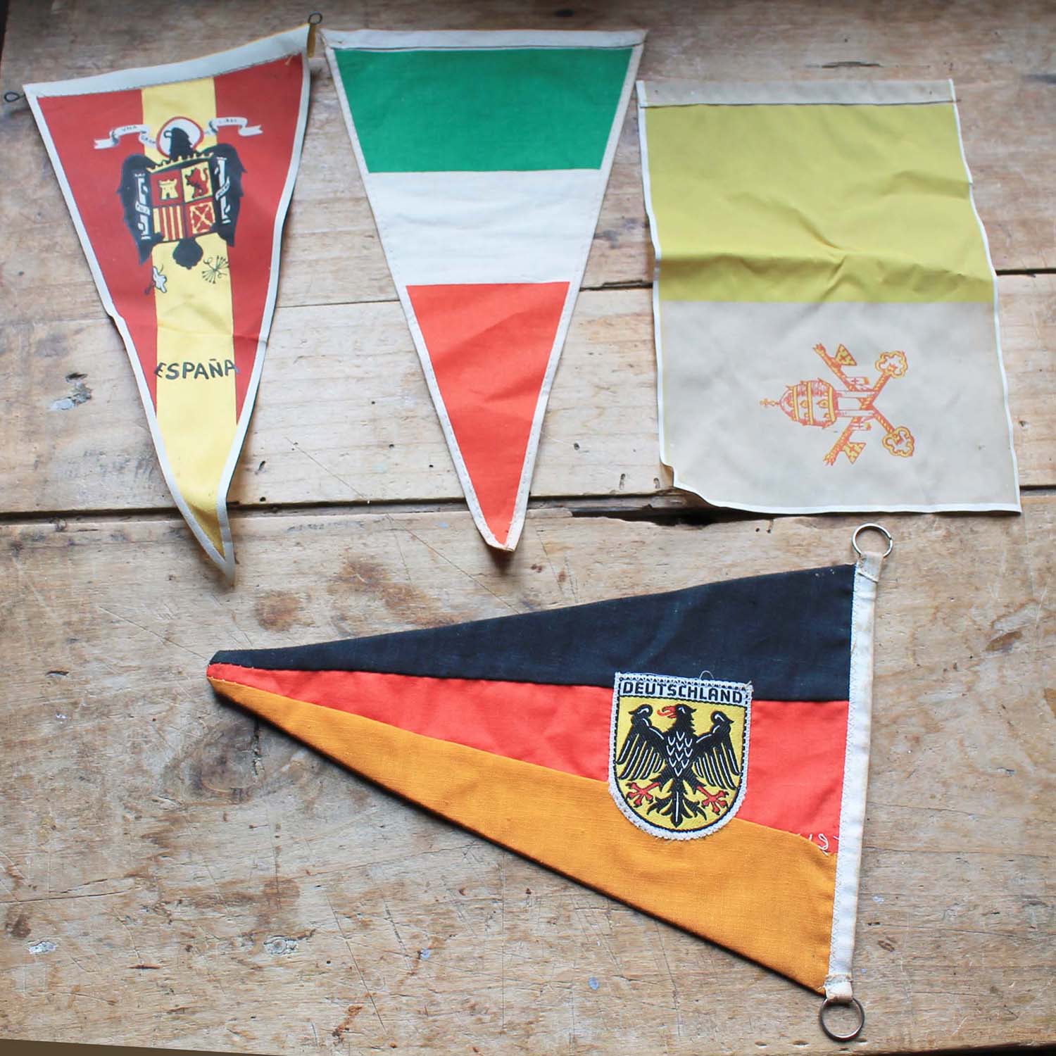 古いヨーロッパの国旗のバナー。 4枚セットです。古いものなので多少の汚れがあります。