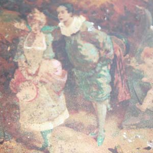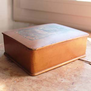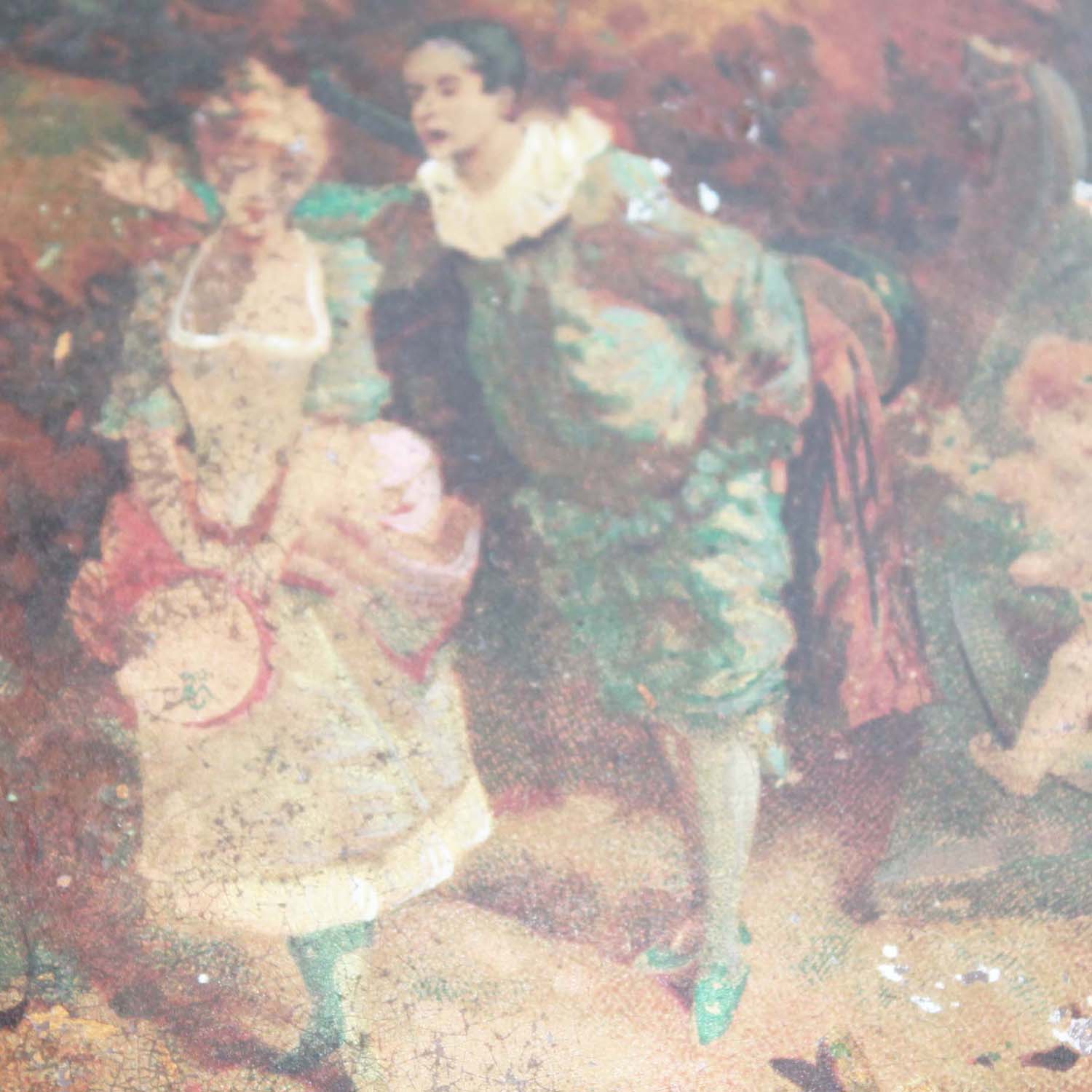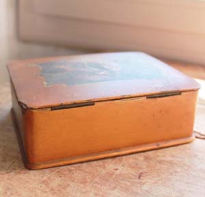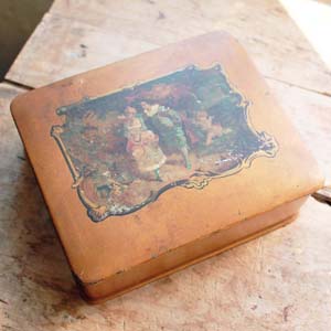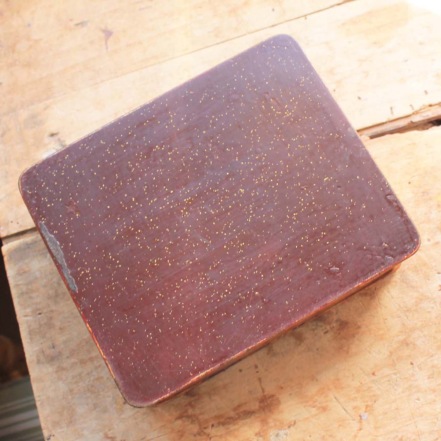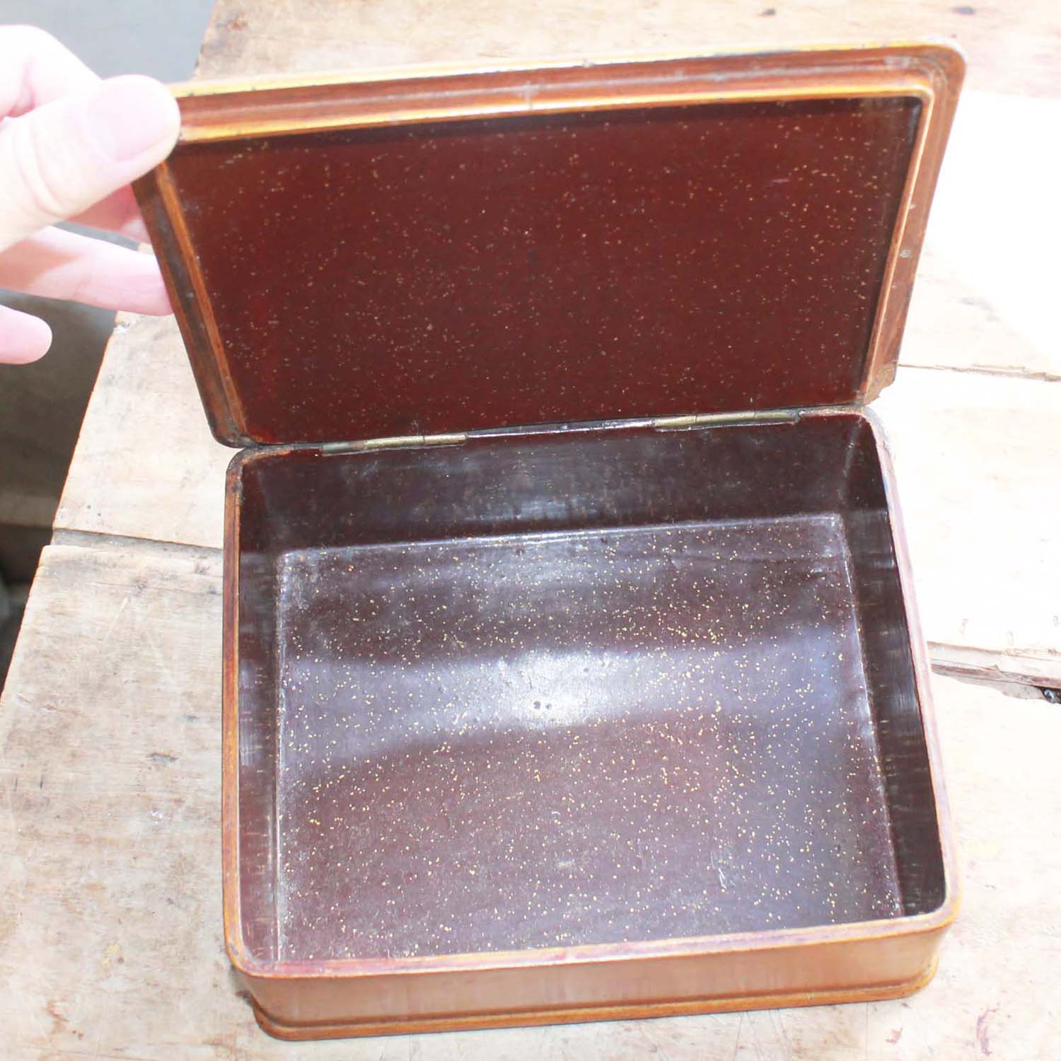 当時の男女の様子が描かれている100年以上前の古い木製ボックス。一部漆が使われています。古い物なので多少傷、汚れ、木の欠けがあります。