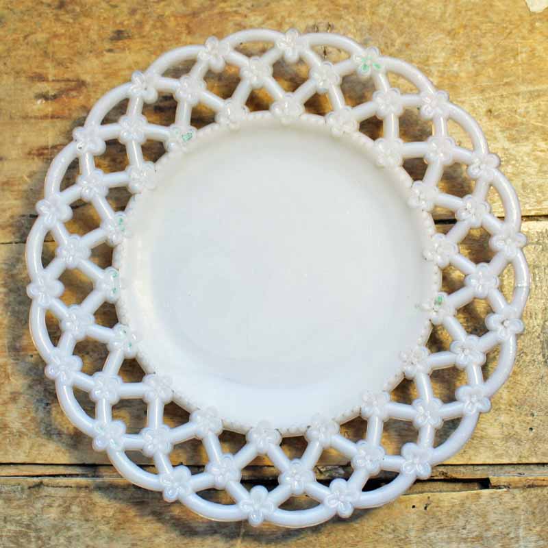 古いミルクグラス製の飾り皿。 白っぽいのですが、薄い藤色みたいにも見えます。古いものなので作られた当時に入ったガラスのよれ、ふちのガラスが多少ガタガタしているところがあります。 また花柄に彩色がしてあったようですが、彩色はほとんど取れていますが、欠け、ラインはありません。