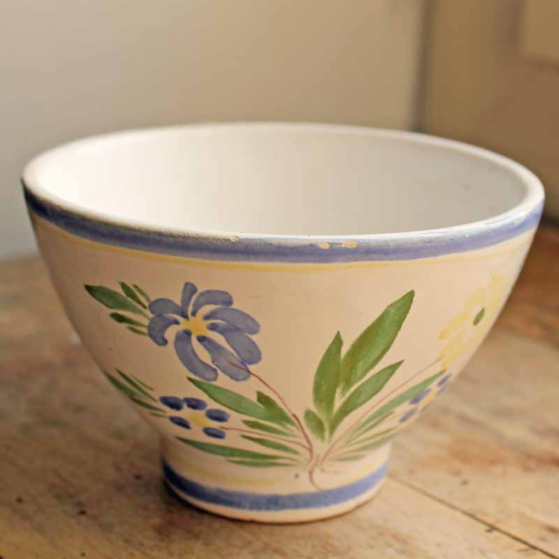 古いカンペール焼きのシードルカップ。 カンペール焼きは17世紀からあるブルターニュ地方カンペールで当時の製作方法をいまだに守っている窯です。 すべてハンドメイド、ハンドペイントなため、フランスだけでなくヨーロッパ、アメリカでもコレクターの多い食器です。そのカンペール焼きのシードルカップになります。 古いものなので傷、汚れ、ふちに釉薬のはがれがありますが、大きな欠け、ラインはありません。