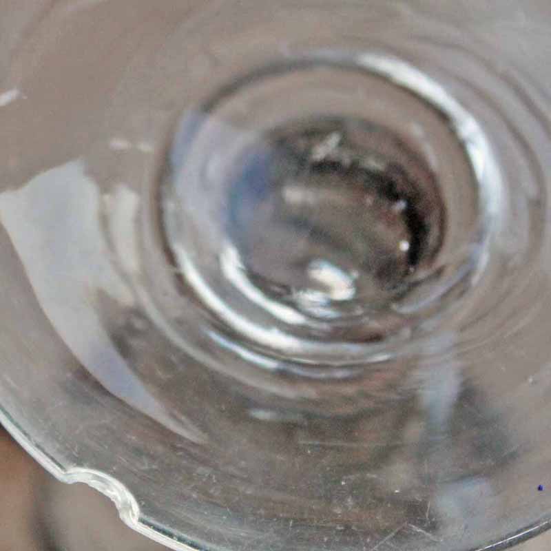 100年以上前の古いワイングラス。カフェやビストロなどで使われたものです。このタイプのグラスはトロンプと呼ばれているそうで、底上げしてお酒の量が多く見えるようになっています。吹ガラス製なので、作られた当時に入った気泡やガラスの歪みがあります。また高台に欠けがありますが使用には問題ありません。