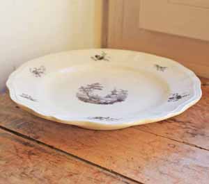 1940年代前後 ディゴアン製のケーキスタンド。 人気の花形リムですが、ベルサイユ宮殿のトリアノンをもしーふにした黒の装飾が施されています。古いものなのでふちにちいさな欠けがあります。