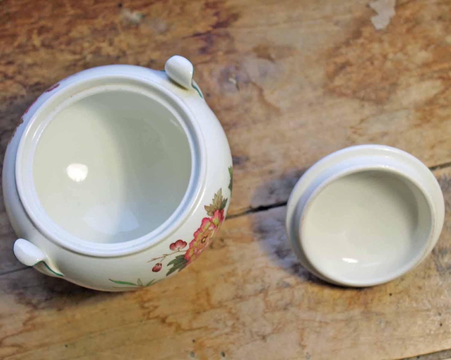 20世紀初期のイギリス製のシュガーポット。Transfer柄にハンドペイントの非常に凝った柄のものです。メーカーはWedgewood of Etrauria & Barlastonです。 古いものなので多少の汚れがありますが、欠け、ラインのないきれいなものです。