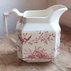 100年ぐらい前の古い小さめのミルクピッチャー。赤のTransfert柄の鳥の絵柄がシックです。古いものなので、多少の傷、汚れ、貫入、シミがありますが、欠け、ラインはありません。