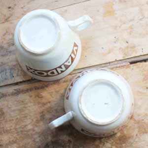 1930年代ぐらいのものと思われる古い陶器製のカップ。スープストックのVIANDOXの販促のもので、非売品でした。古いものなので多少の傷、汚れがありますが、欠け、ラインはありません。