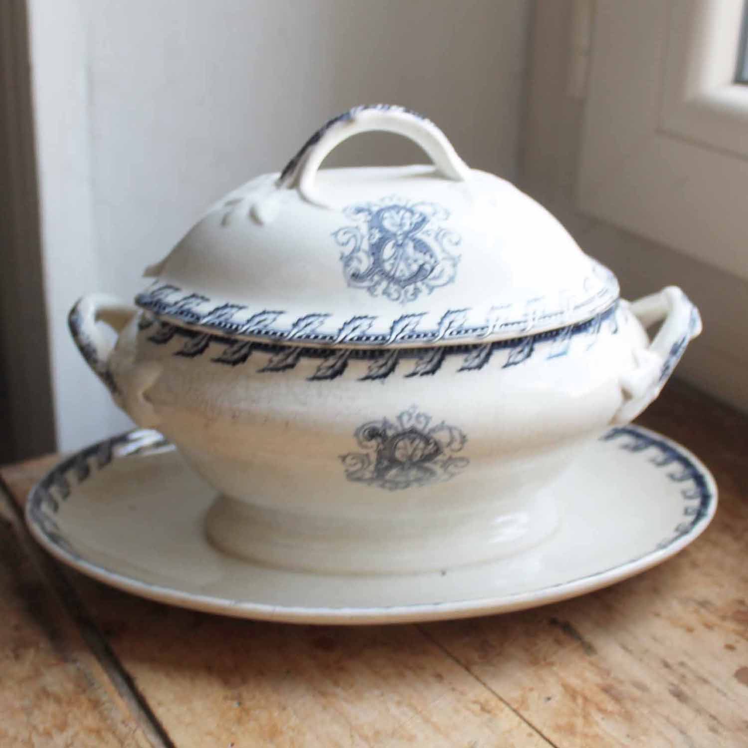 100年ぐらい前の古いリュネビル製のソーシエール。 イニシャルBのモチーフがシックです。古いものなのでふたの淵に小さな欠け、本体に貫入があります。
