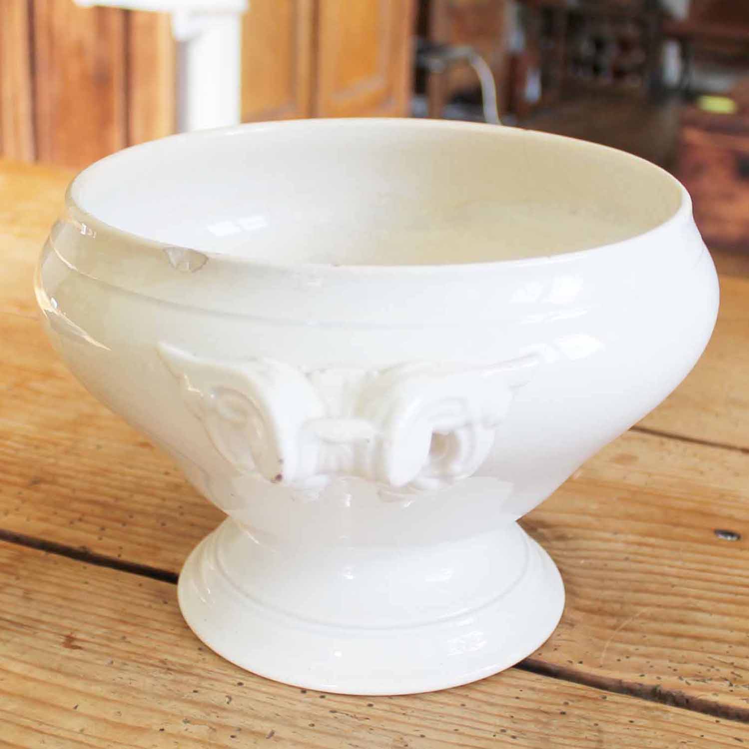 100年ぐらい前の古いスーピエール。普通の物より1回り小さいです。古いものなので傷、汚れ、貫入、シミ、蓋がありません。 欠けもありますので、かくやすのお値段を付けました。