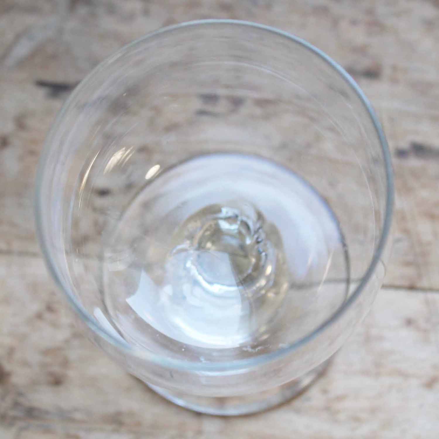 100年ぐらい前の古いワイングラス。吹きガラス製です。ビストロで使われていたものです。古いものなので作られた当時に入った気泡、ガラスのよれがありますが、欠け、ラインはありません。