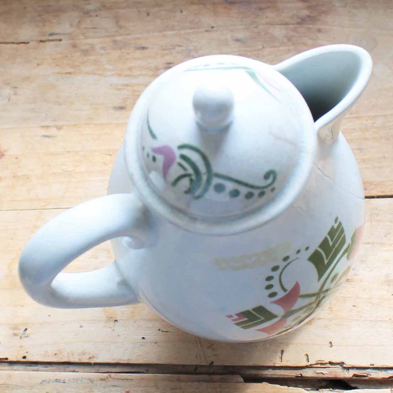アールデコのデザインがシックなコーヒーポット。ギャラリーラファイエットの刻印が入っています。古いものなので傷、汚れ、貫入、シミ、ふたにラインがあります。