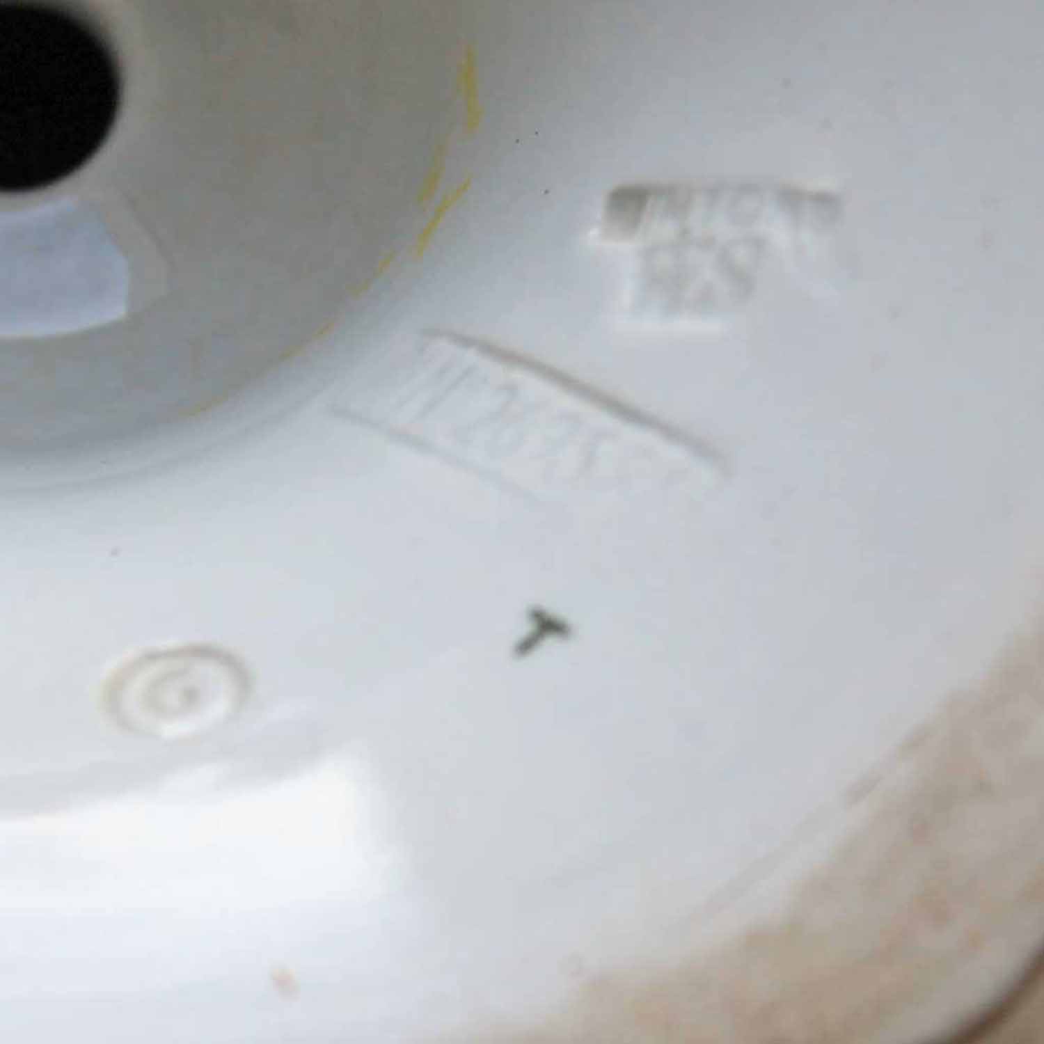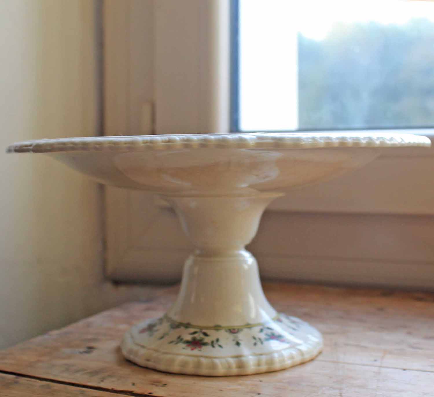 1909年の刻印が入っているMinton社製のコンポティエ。Transfert柄にハンドペイントで彩色してあります。古いものなので貫入、シミ、傷、汚れがありますが、欠け、ラインはありません。