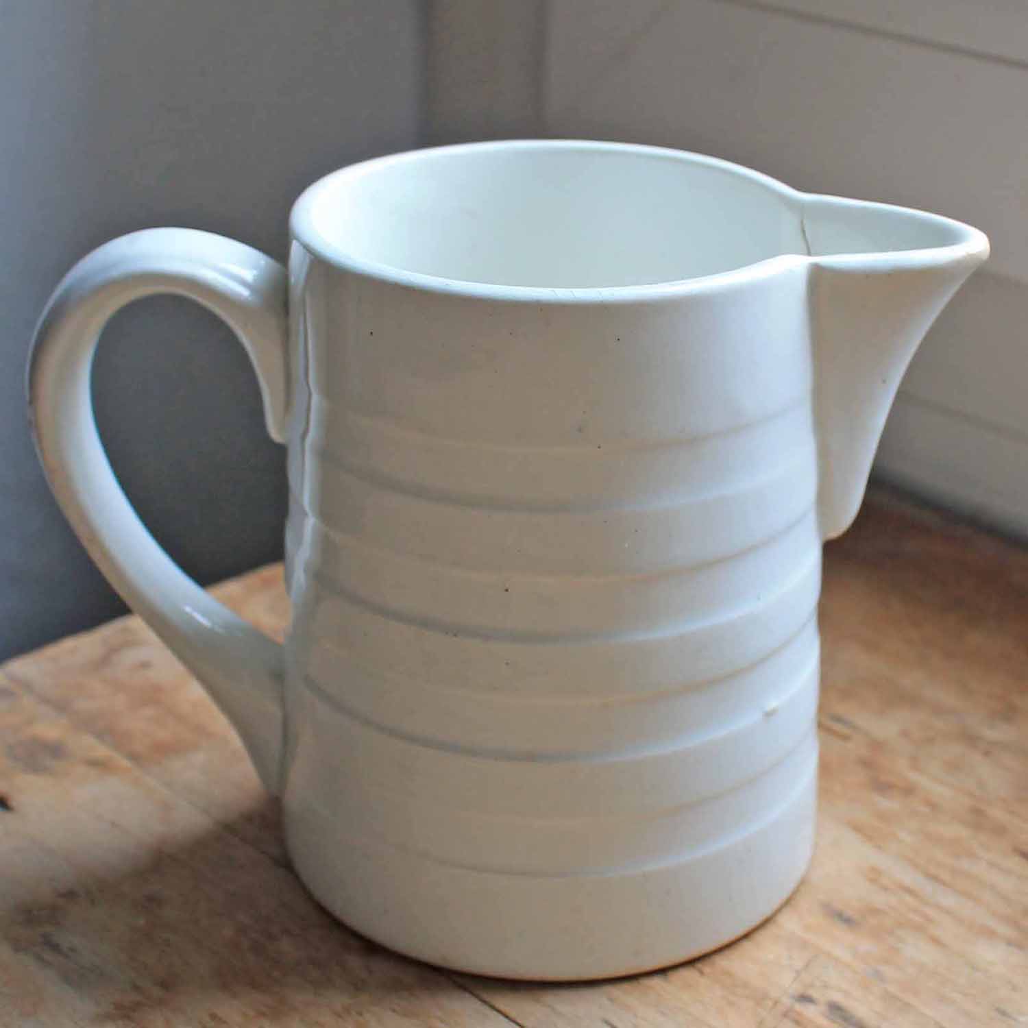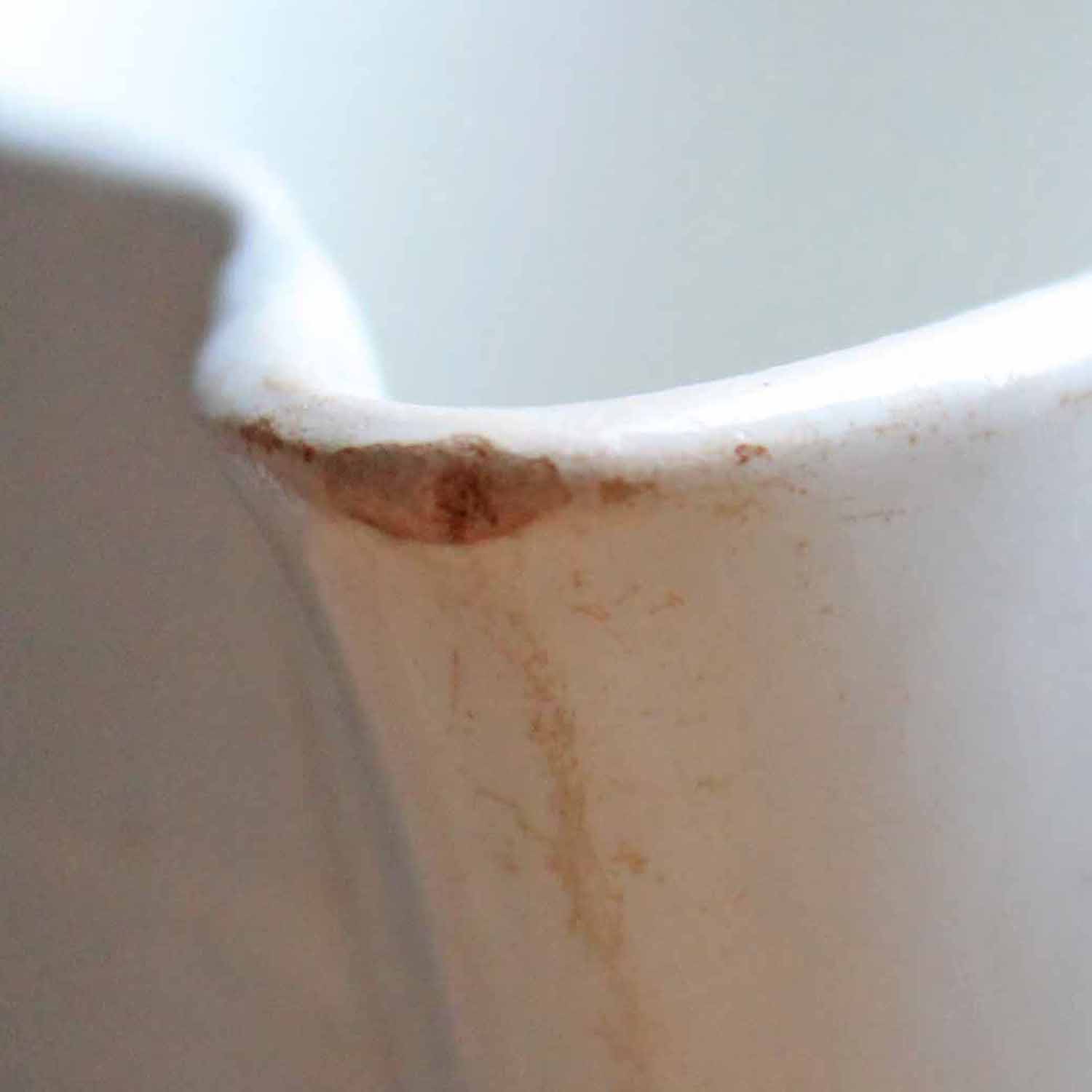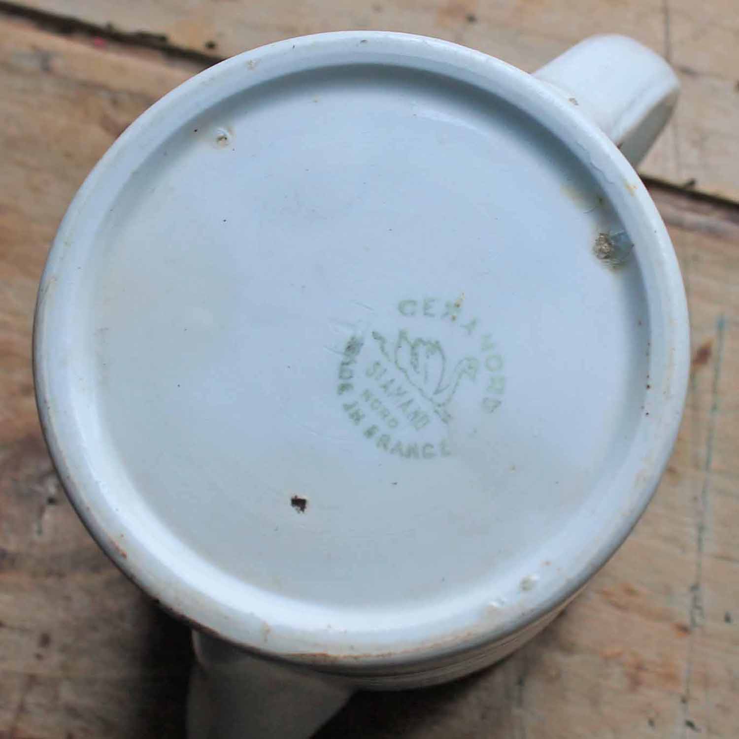 100年ぐらい前の古い陶器製のピッチャー。St Amand製です。古いものなので注ぎ口にに小さな釉薬の剥がれ、傷、汚れ、貫入がありますが、欠け、ラインはありません。