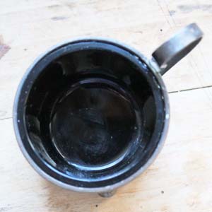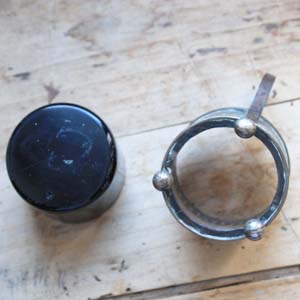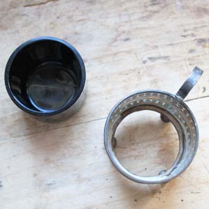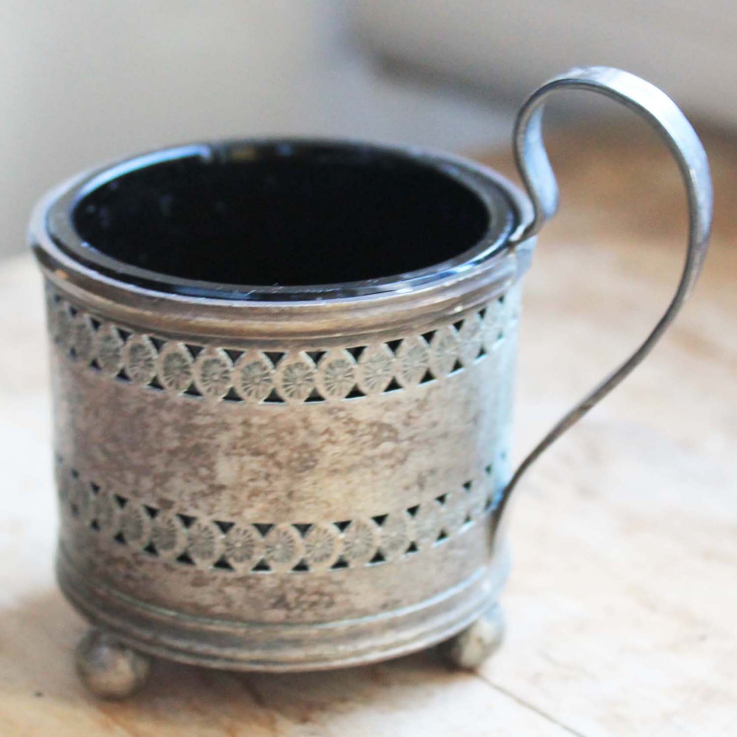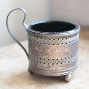 カップ型の容器。枠は金属製、内側は吹きガラス製です。古いものなのでガラスのふちに細かい欠けがあります。