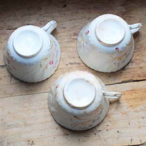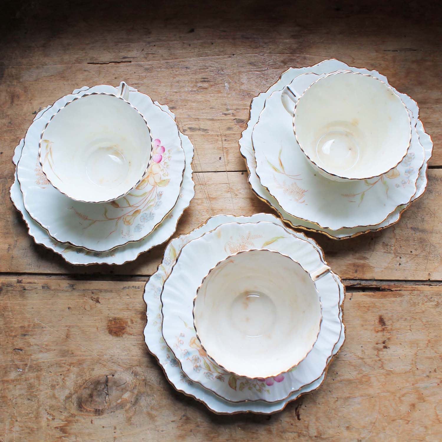 古いトリオ(カップ、ソーサー、デザート皿)のセット。 イギリス製です。古いものなので傷、汚れ、貫入がありますが、欠け、ラインはありません。