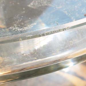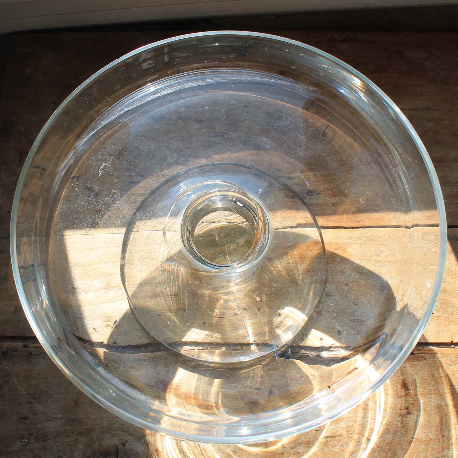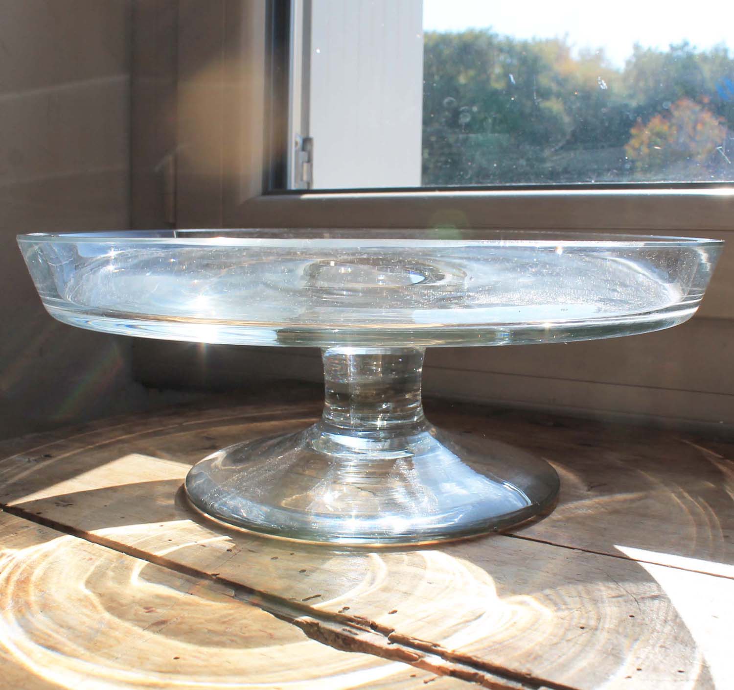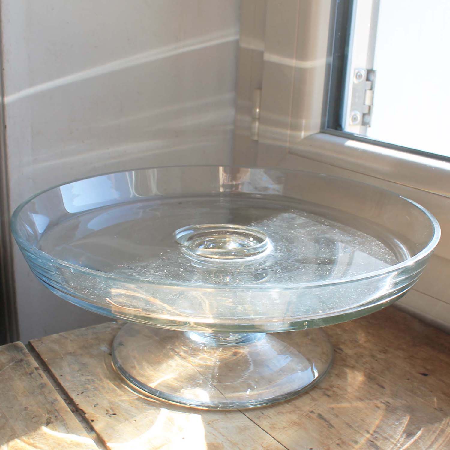 古い吹きガラス製のケーキスタンド。古いものなので多少の傷、汚れ、淵に細かい欠け(ゴマ粒大)があります。