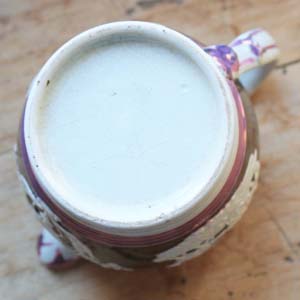 エンボスのデザインがシックな軟陶器製のピッチャー。 ラスターウエアです。 古いものなので淵に小さな欠けがあります。