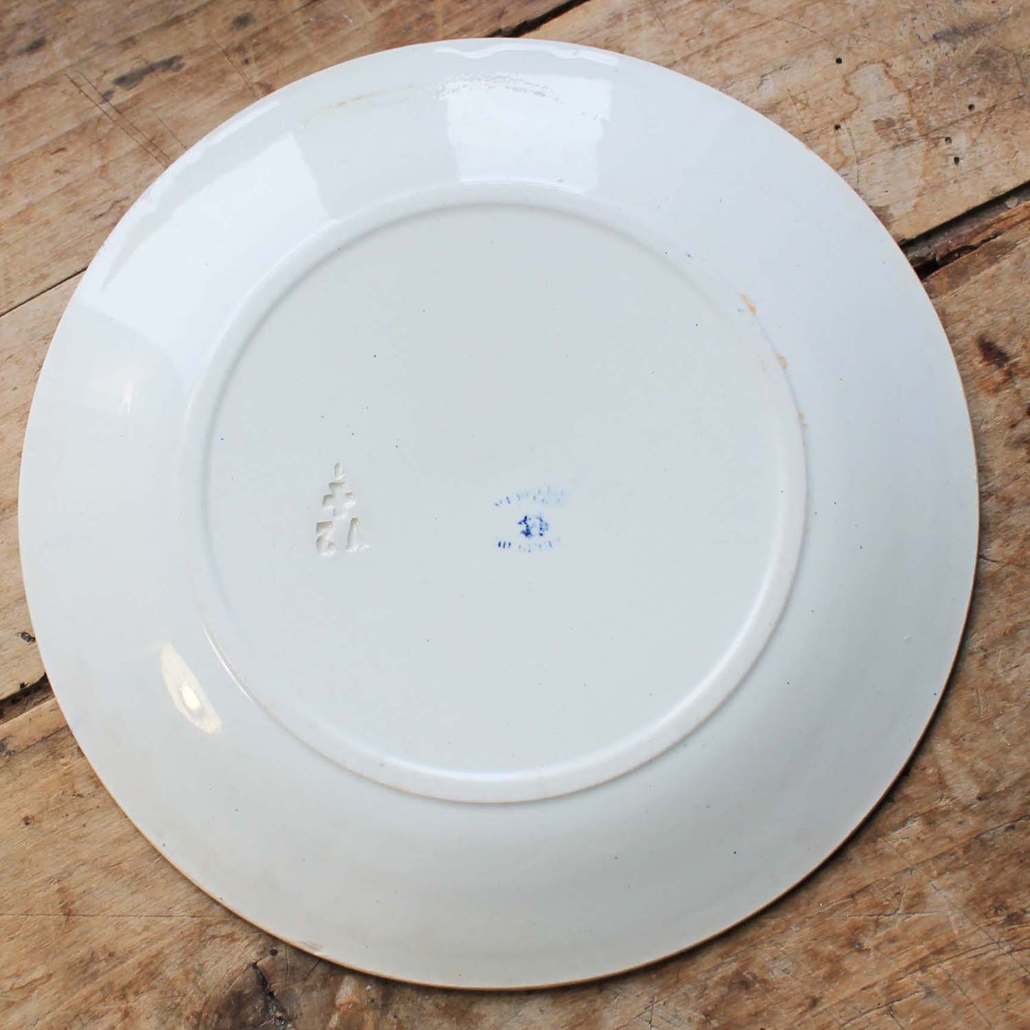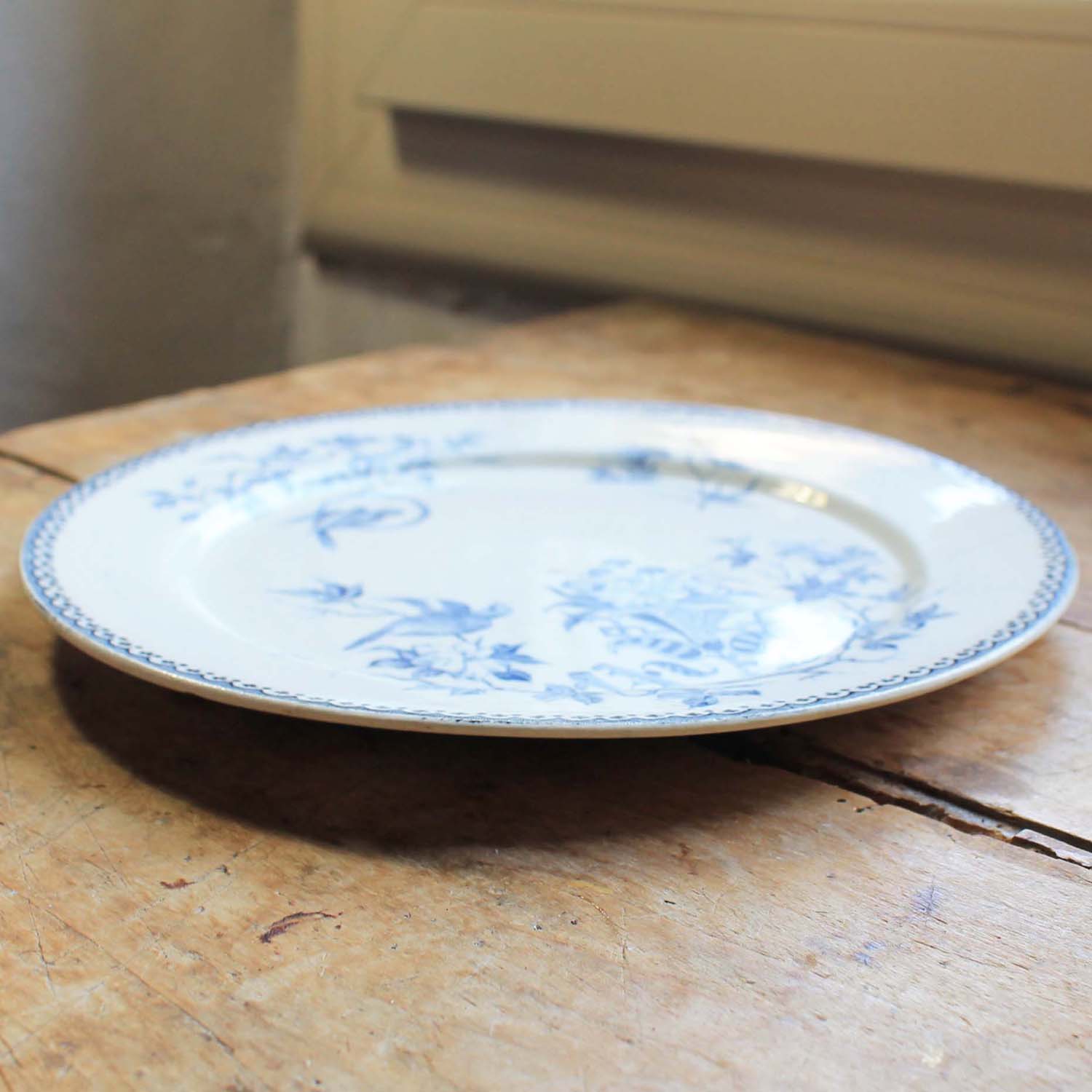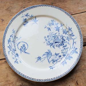 100年ぐらい前の古いクレイユ&モントロー製のお皿。 鳥柄になります。古いものなので裏側のふちにゴマ粒大の小さな欠けが入っています。大きな欠けに見えるところは作られた当時に入った難です。