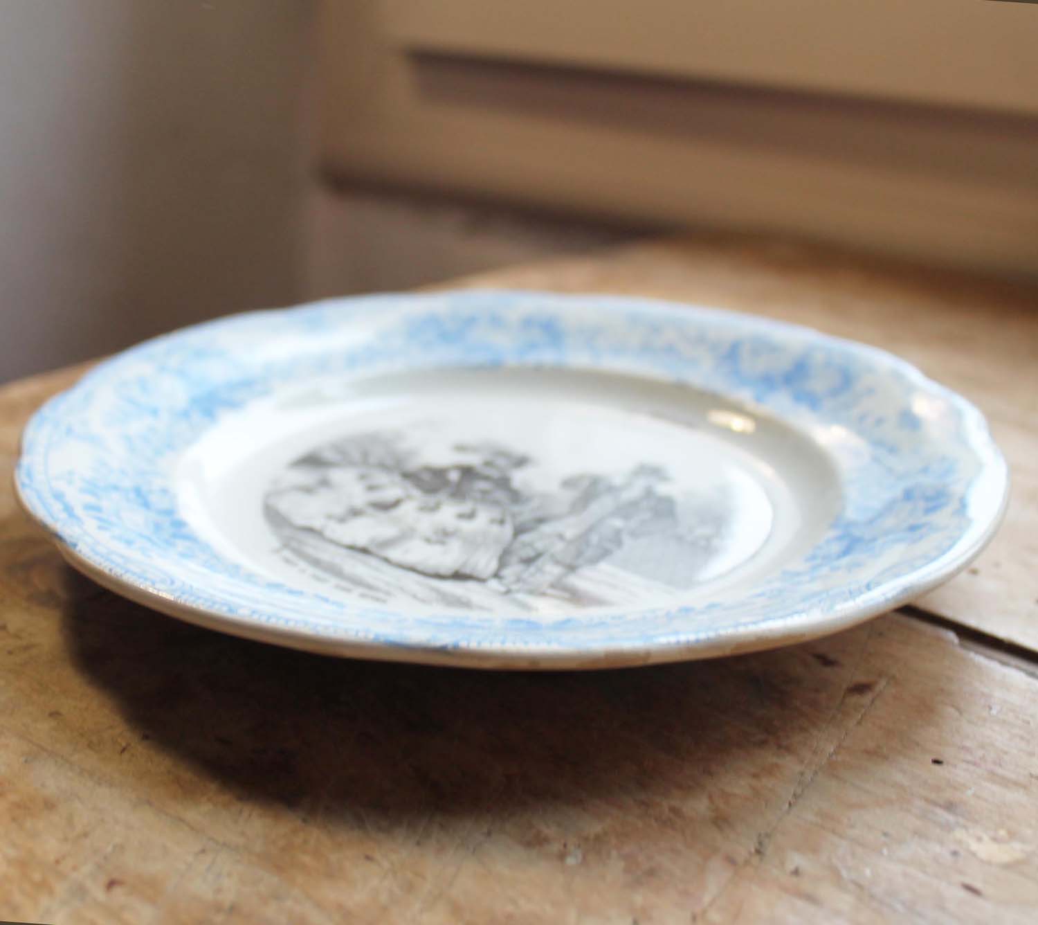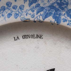 19世紀のドレスについての絵柄がかわいいデザート皿。モチーフが当時のドレスの中に入れた支え Crenolieについてでとても珍しいです。古いものなので傷、汚れ、貫入があります。