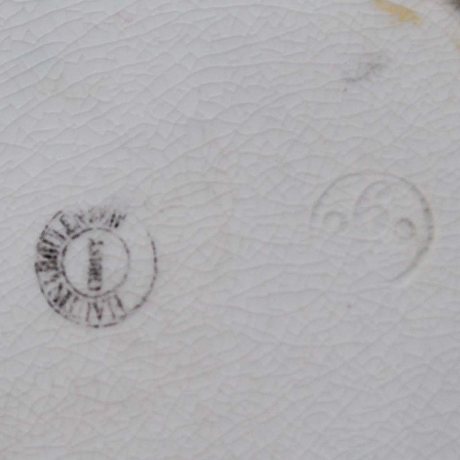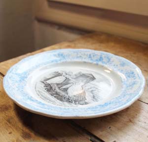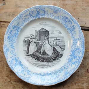 19世紀のドレスについての絵柄がかわいいデザート皿。モチーフが当時のドレスの中に入れた支え Crenolieについてでとても珍しいです。古いものなので傷、汚れ、貫入があります。