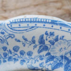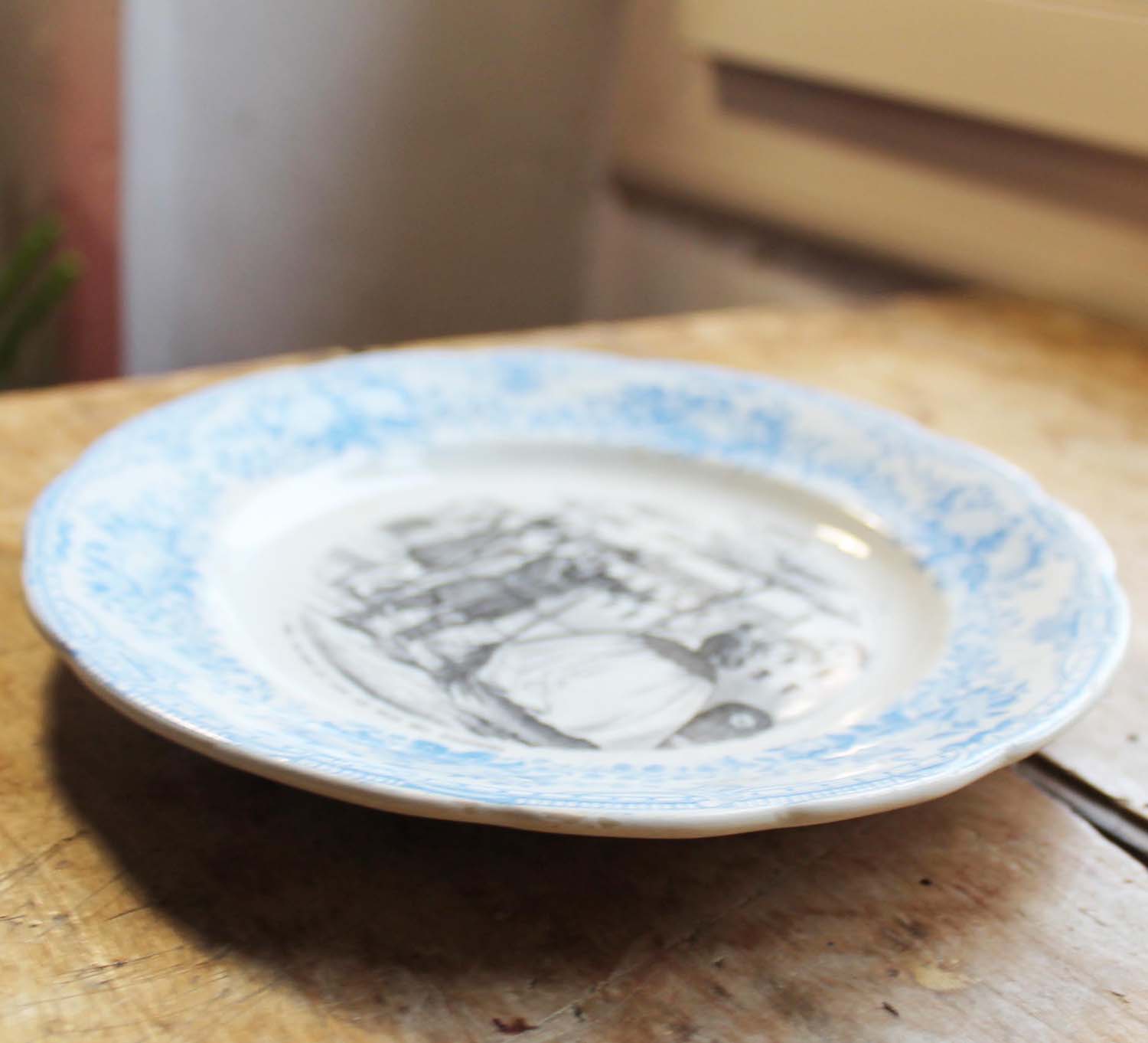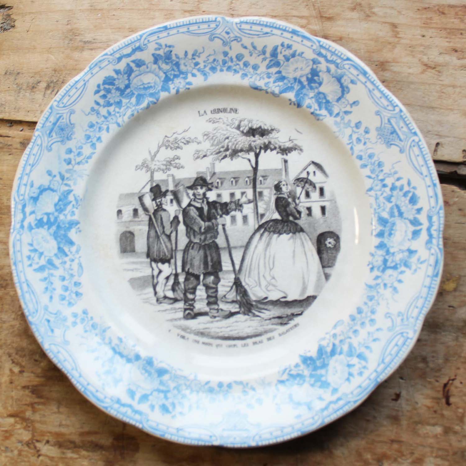 19世紀のドレスについての絵柄がかわいいデザート皿。モチーフが当時のドレスの中に入れた支え Crenolieについてでとても珍しいです。古いものなので傷、汚れ、貫入。淵に釉薬の剥がれがあります。