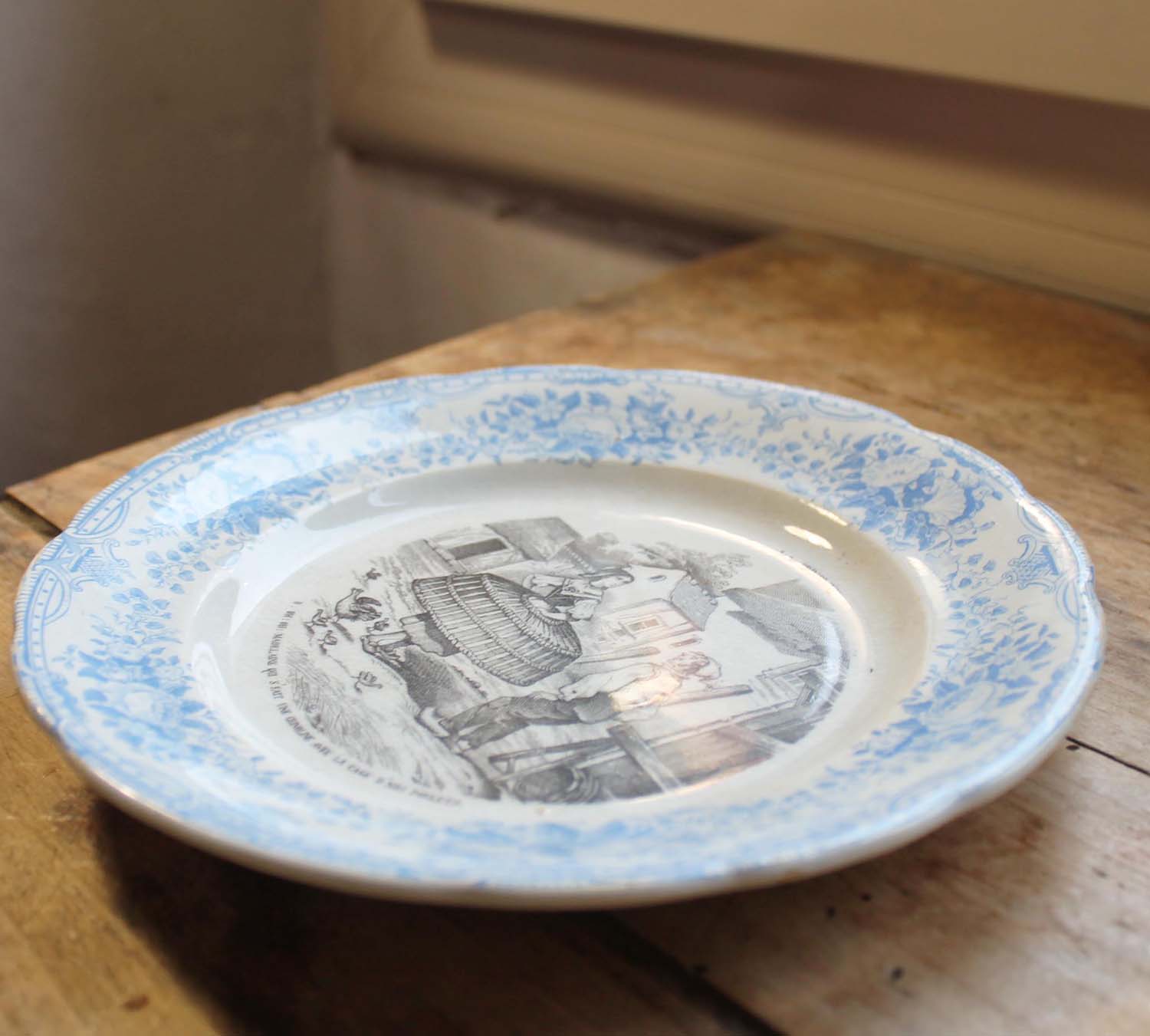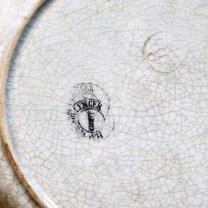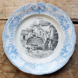 19世紀のドレスについての絵柄がかわいいデザート皿。モチーフが当時のドレスの中に入れた支え Crenolieについてでとても珍しいです。古いものなので傷、汚れ、貫入。淵に釉薬の剥がれがあります。
