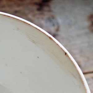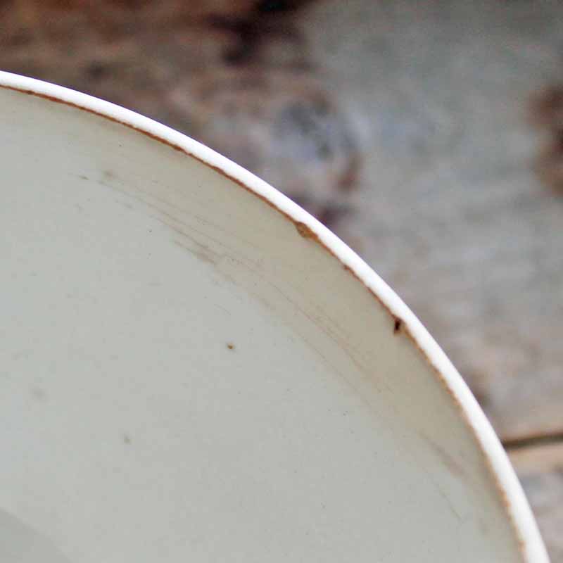大きなサクランボ柄のカフェオレボウル。形もまるく、本などにも紹介されているカフェオレボウルです。手描きのサクランボがシックです。古いものなので、貫入、シミがすが、欠け、ラインはありません。(高台のラインのようなものは作られた当時に入った難です)