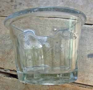 古い台形のジャムジャー。 古いものなので作られた当時に入った気泡やガラスのよれ、淵に欠けがあります。
