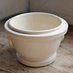 手のひらサイズの小さなパテ用ポット。多分フォアグラのパテ用だったものだと思います。古いものなのでふたがありません。貫入、シミ、傷がありますが、大きな欠け、ラインはありません。