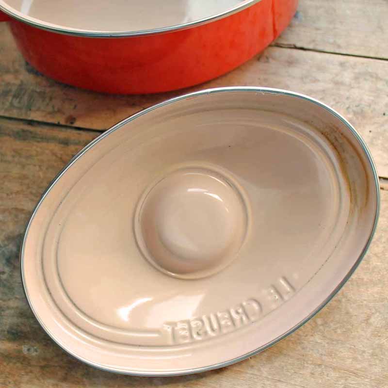 軽いルクルーゼのおなべ。 とっても軽いホーロー製です。 ふたにはLe Creusetの刻印入り、ルクルーゼ特有のオレンジ色もうれしい商品です。 日本では未発売商品だそうです。小さめのものなので、一人暮らしの方や、カップルでお住まいの方にいいと思います。 ちょっとオレンジのホーローが欠けている所、汚れがありますが、基本的に良いコンディションです。 ほとんど使った形跡がありません。