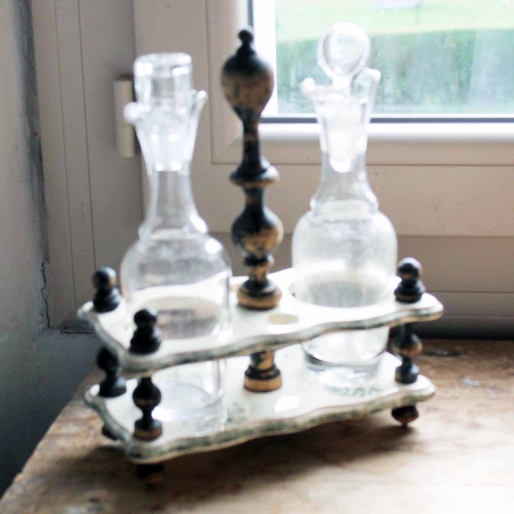 100年ぐらい前の古いビネガー&オイル用ボトルセット。テーブルに出すものです。 珍しいもので一部に陶器が使われています。ボトルのふたの一つがもともとのものではありません。多少の傷、汚れはありますが、欠け、ラインはありません。