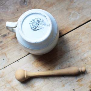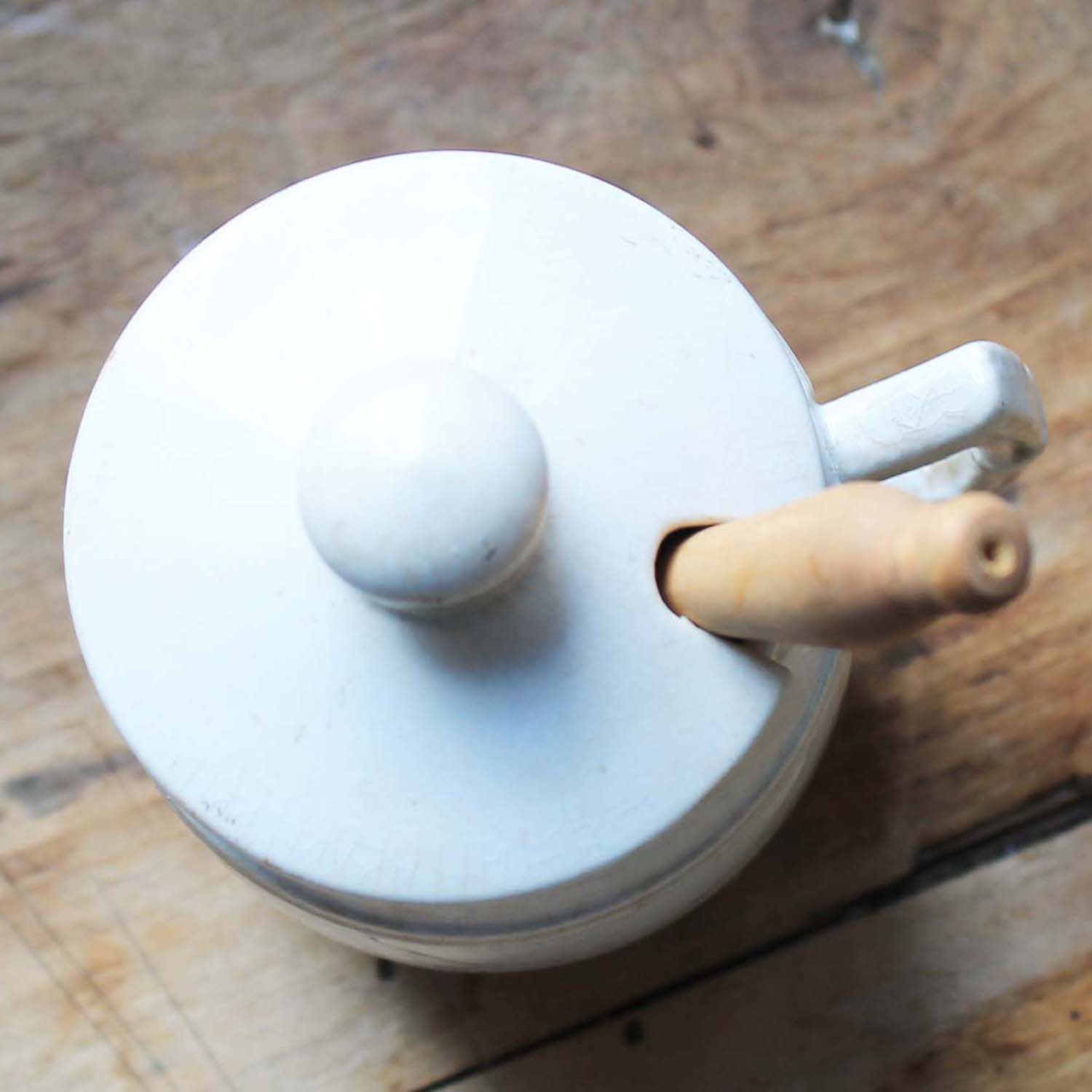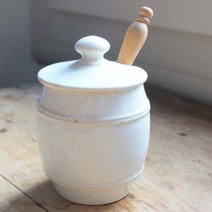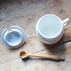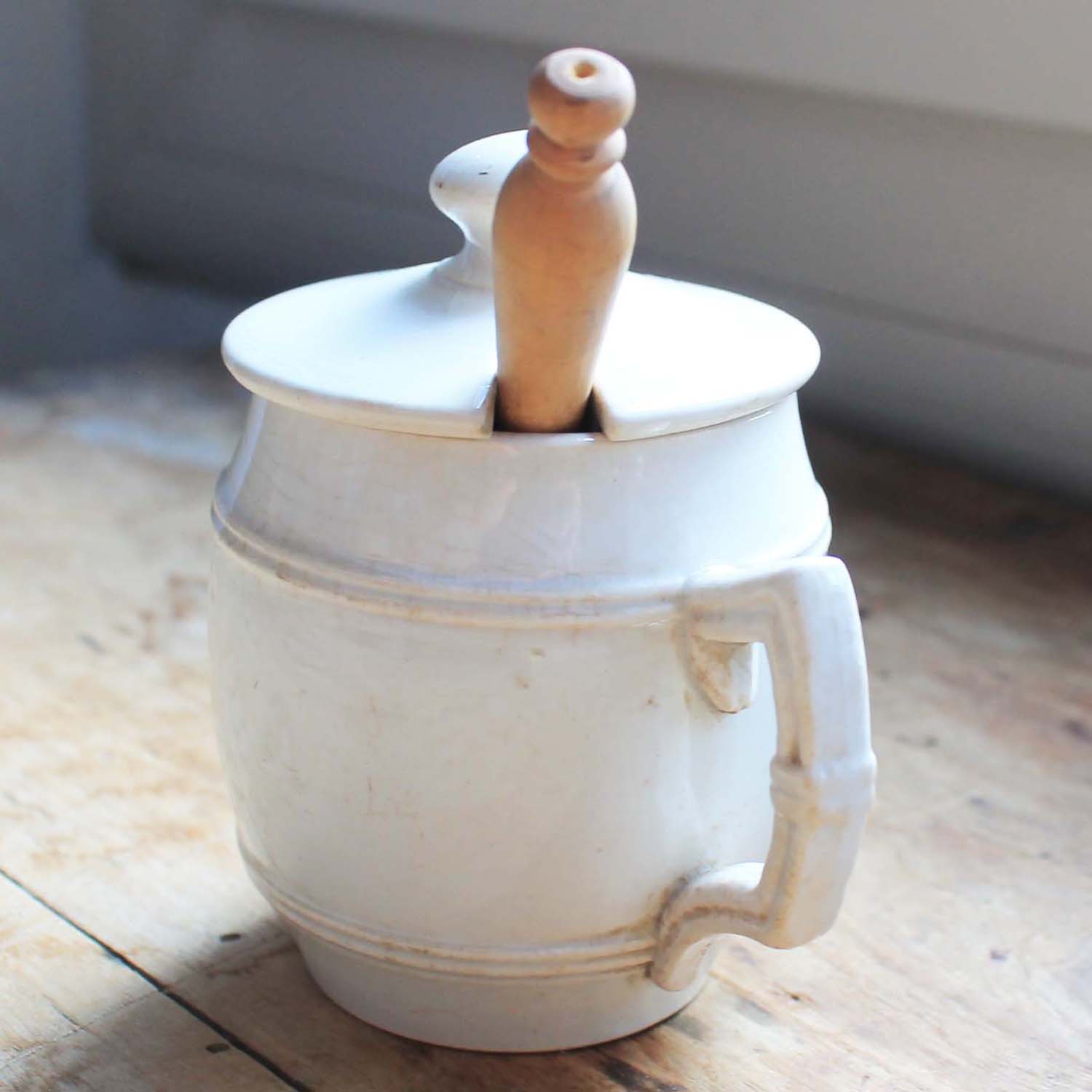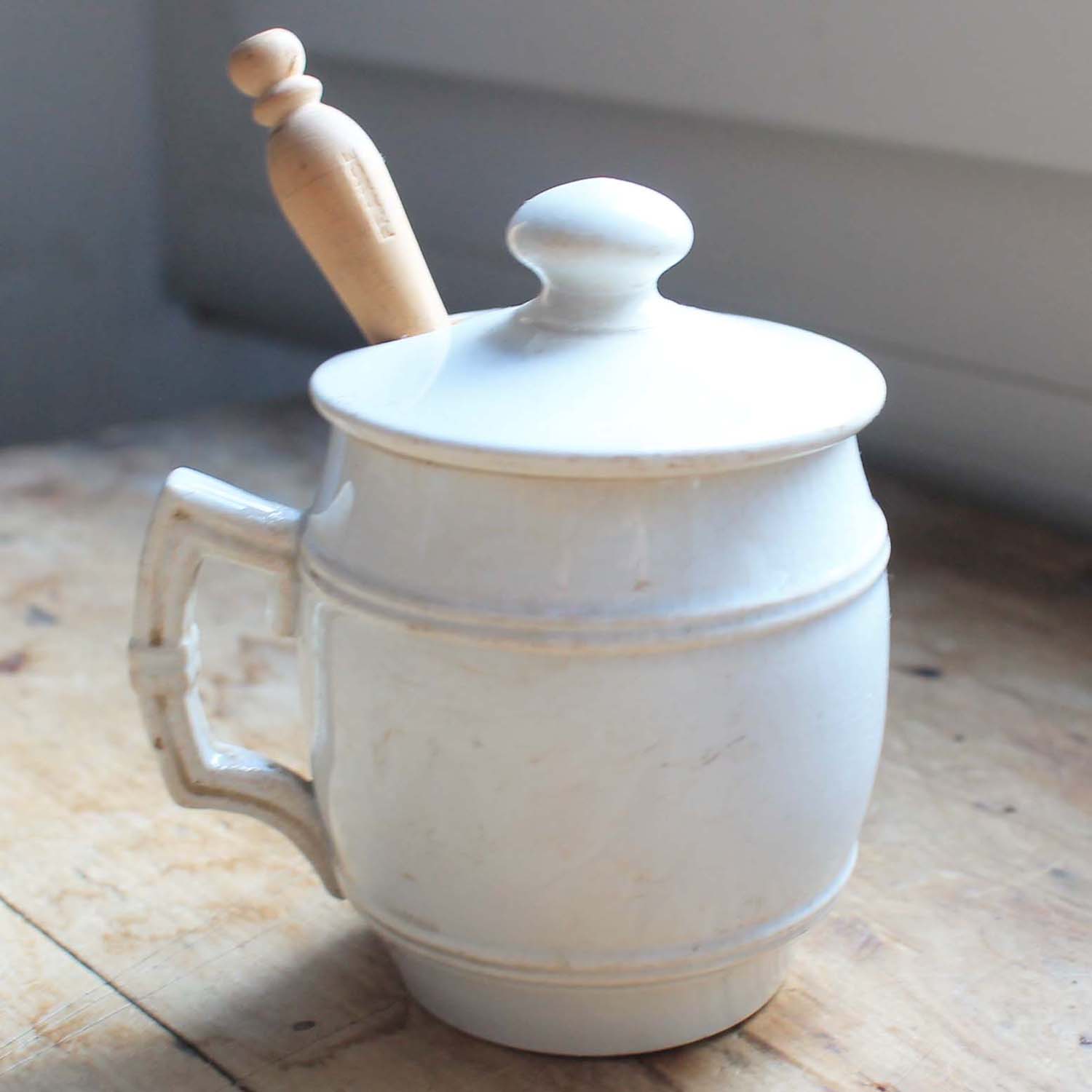 100年ぐらい前の古いDigoin製のマスタード用ポット。 木製のスプーン付きです。古いものなので多少の傷、汚れ、裏の高台にゴマ粒大の欠けがありますが、それ以外にダメージはありません。
