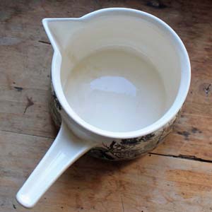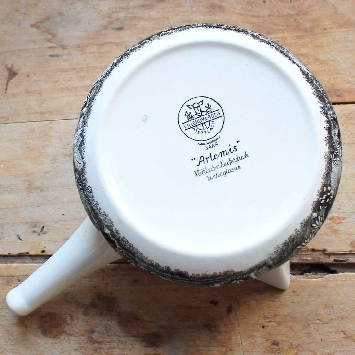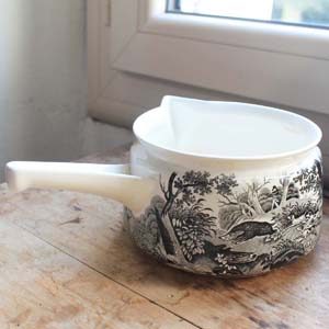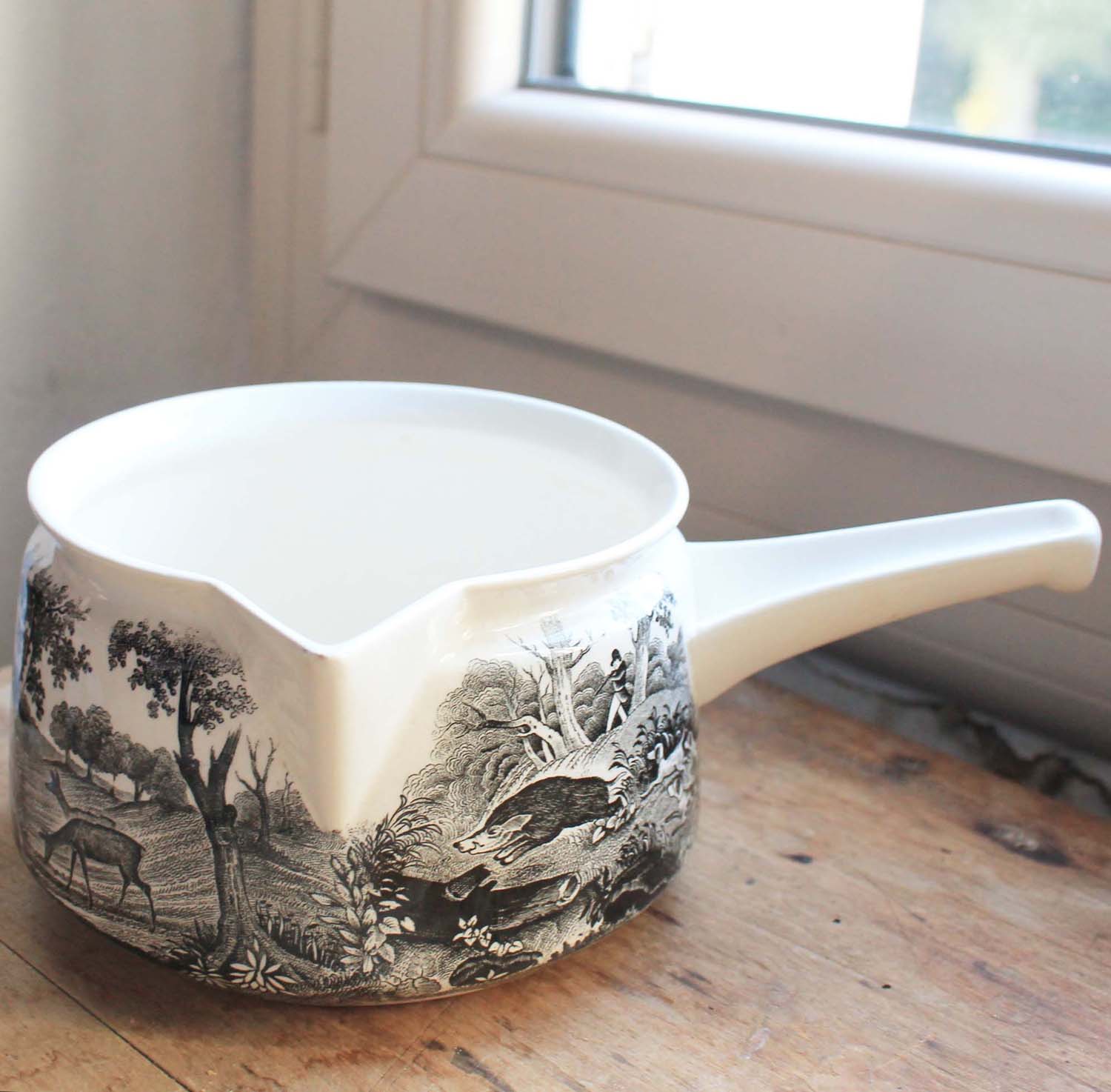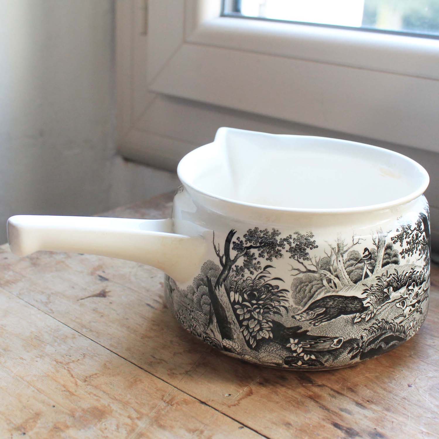 中古の陶器製のお鍋。 19世紀の黒のTranwfert柄が使われています。古いものなので多少の傷、汚れ、貫入、シミがありますが、欠け、ラインはありません。