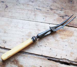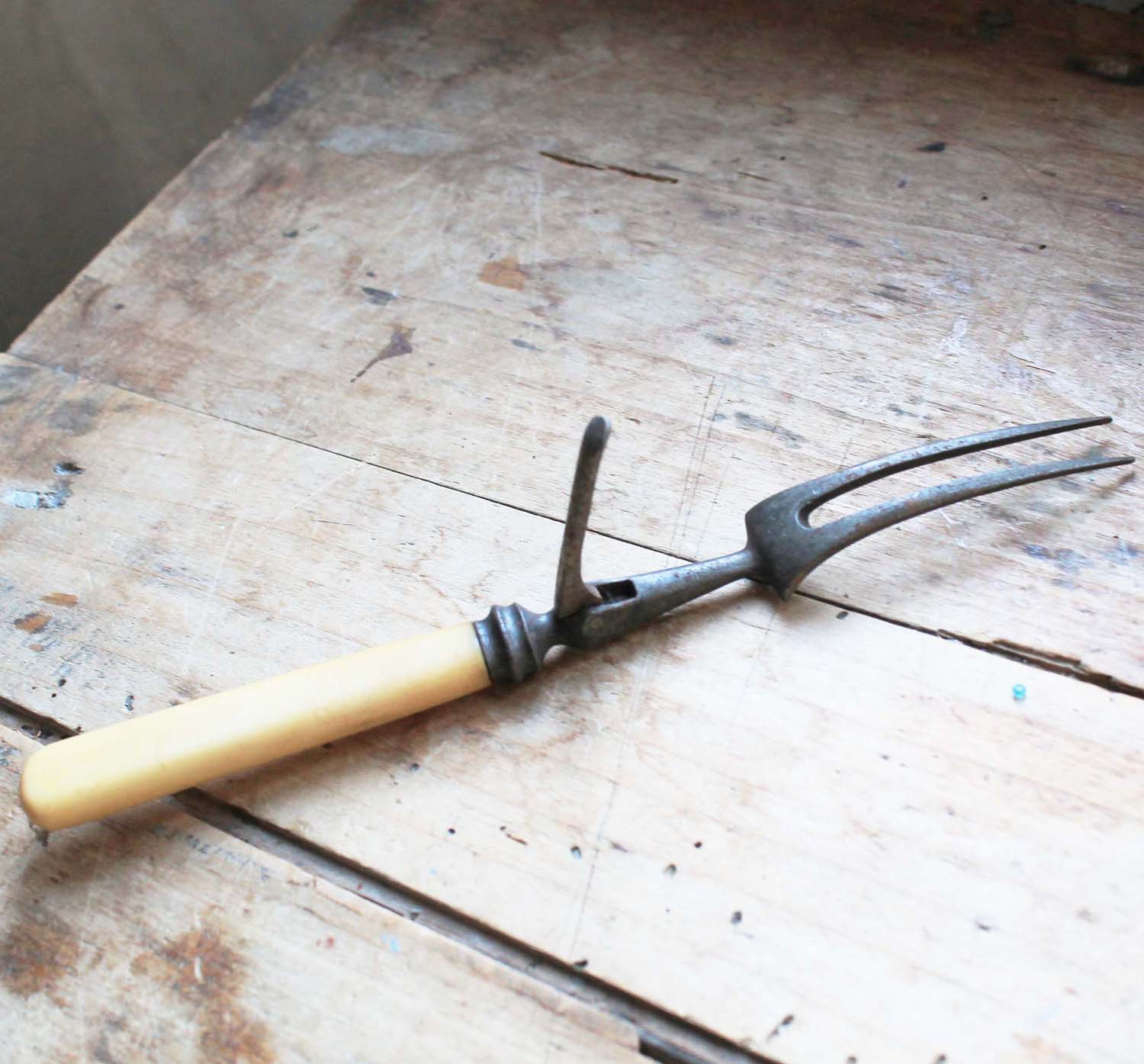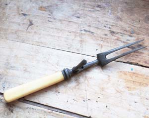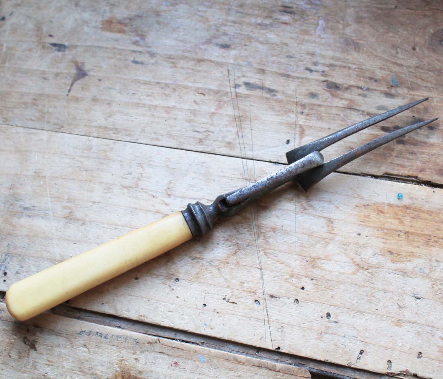 古いカービングフォーク。持ち手はベークライトです。古いものなので多少の傷、汚れ、さびがあります。