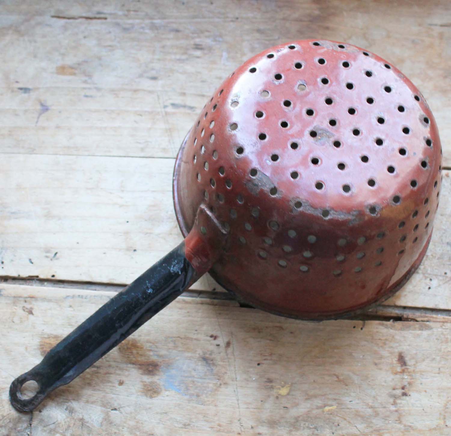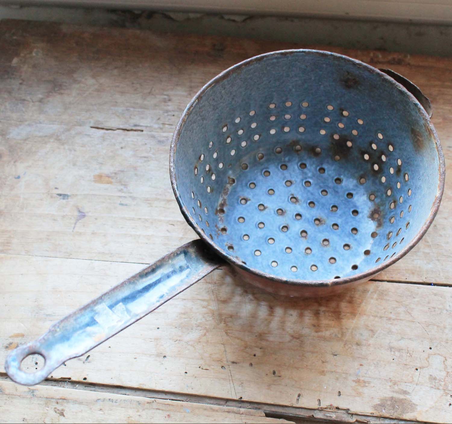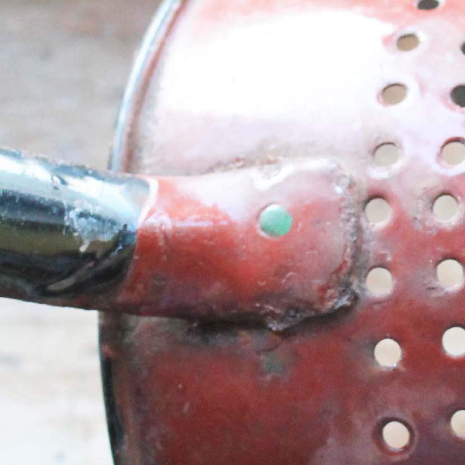 100年ぐらい前の古いホーロー製のザル。持ち手をリベットでつけているので、古いものになります。多少汚れ、傷、ホーローの剥がれ、さびがあります。