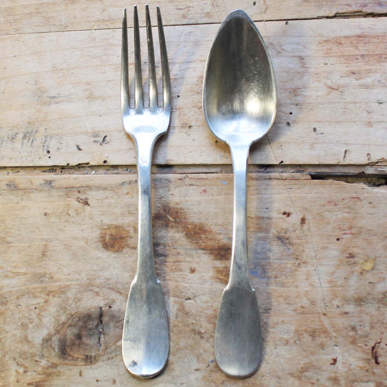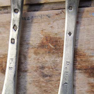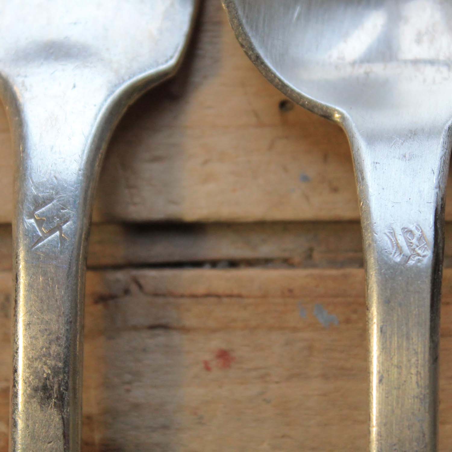 1700年代後半 オランダ スホーンホーフェン の銀の刻印が入っているフォーク&スプーン。 刻印がしっかり入っています。 250年近く前のものなので、多少でこぼこがあります。本物のアンティーク銀カトラリーをお探しの方に。