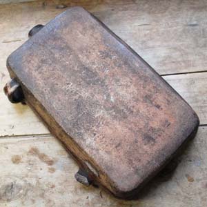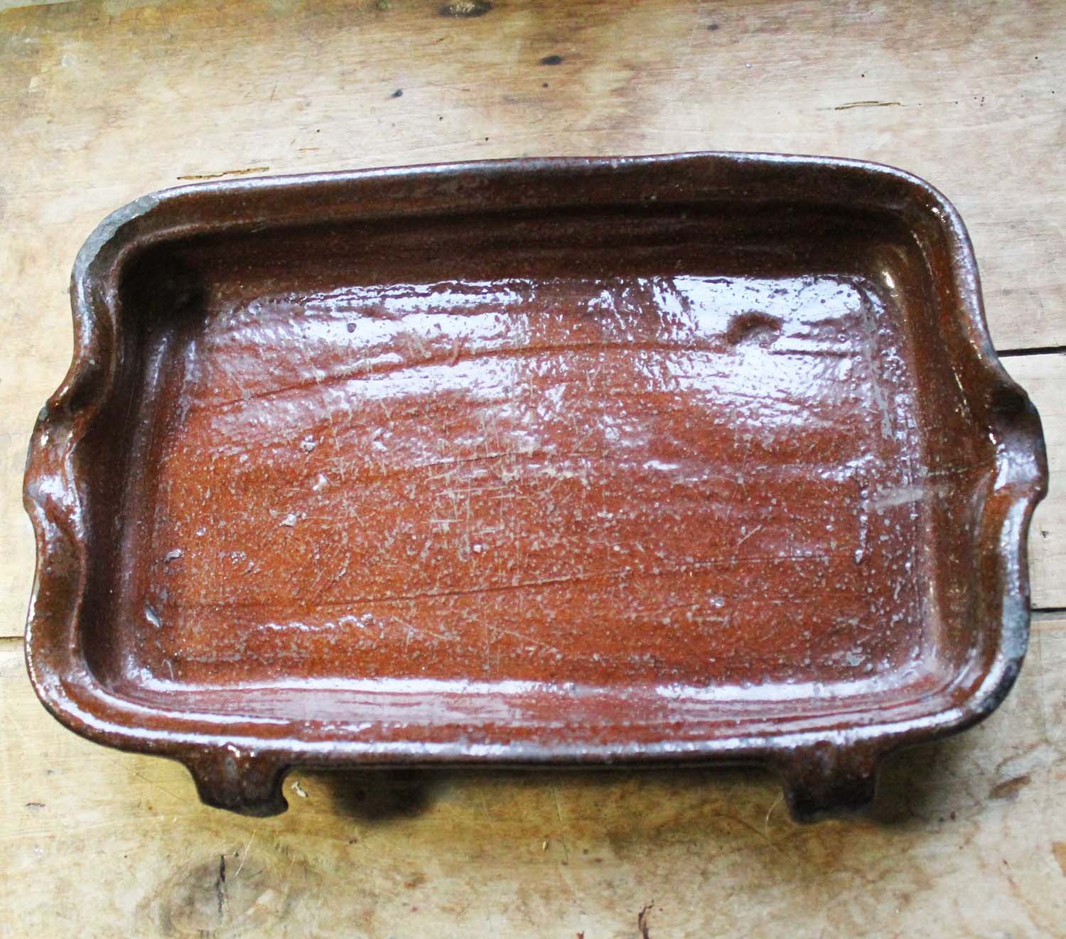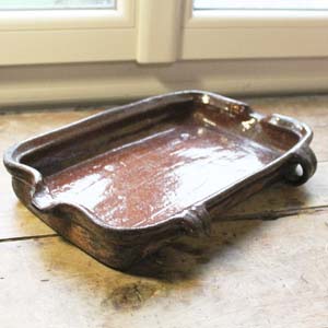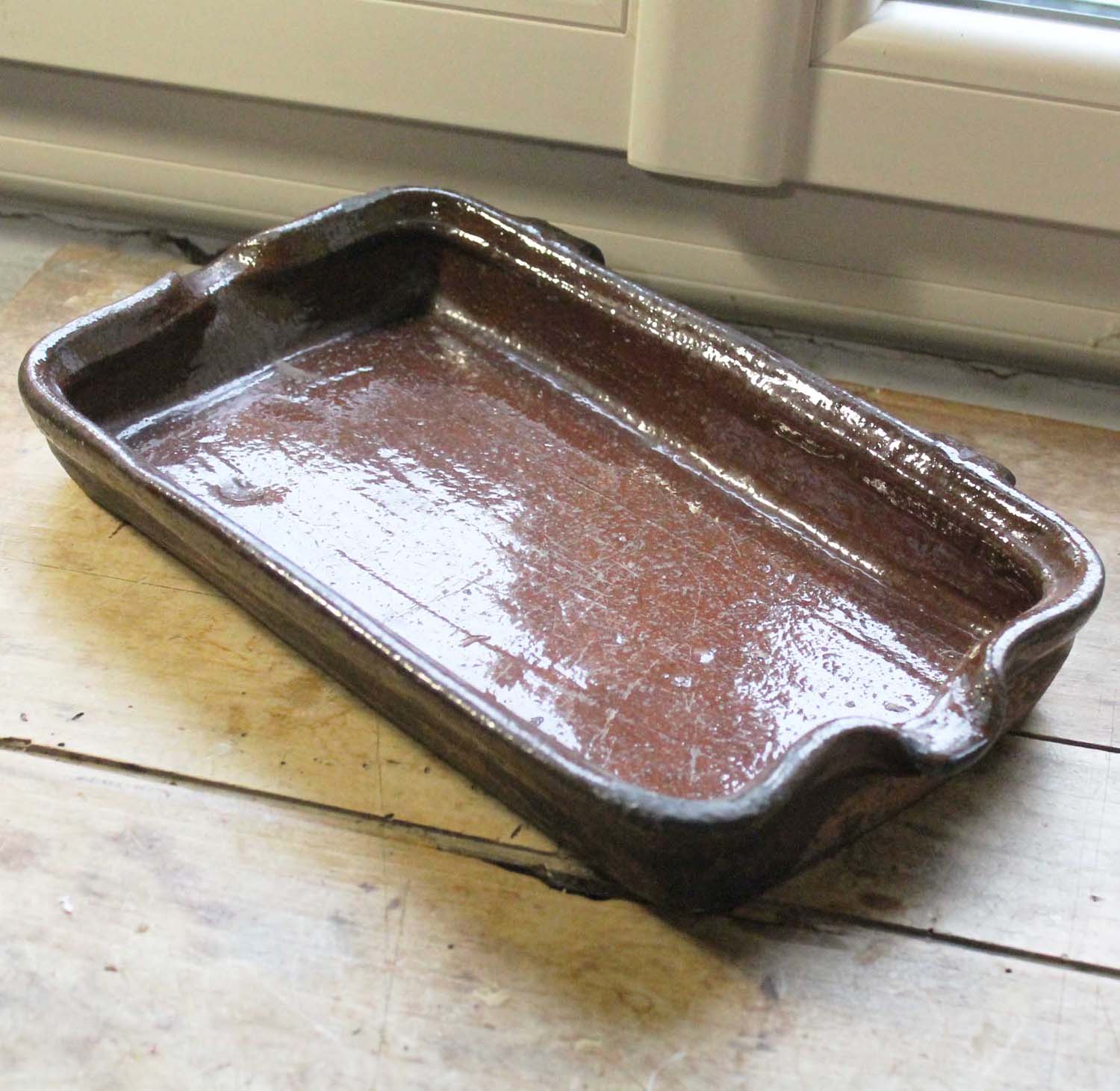 100年以上前の古いテラコッタ製のドリッピングパン。 暖炉で肉をローストするときに肉の下に置いたもので、落ちてくる油や肉汁を使ってジャガイモを料理したりするのに使いました。この商品は持ち手の一つにダメージがあります。