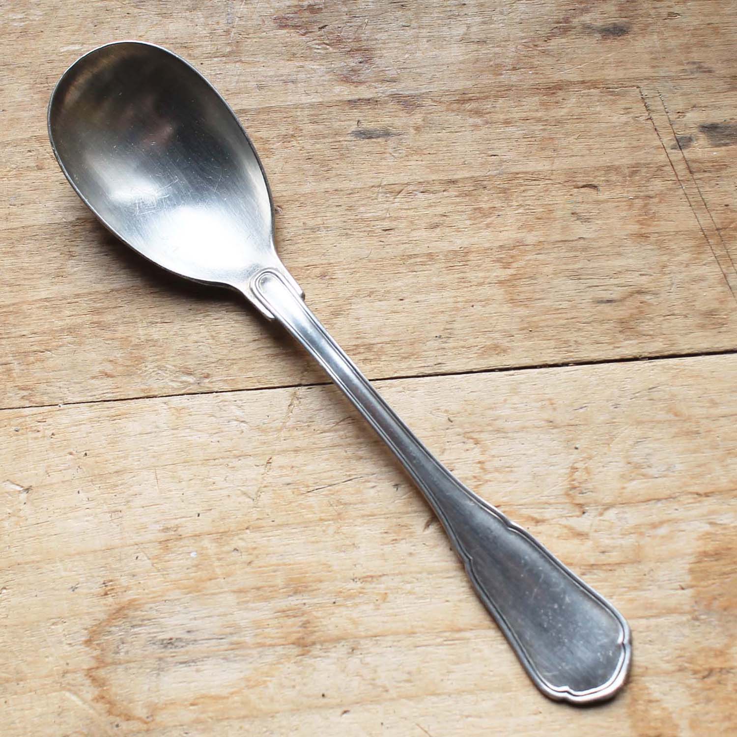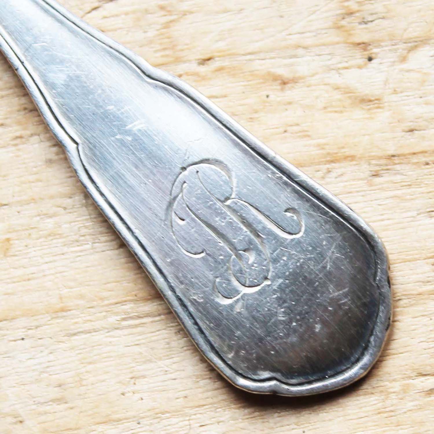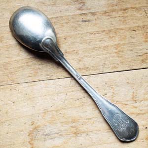 シルバープレートのかわいいスプーン。TR (RT)のイニシャルが入っています。古いものなので多少傷、汚れがあります。