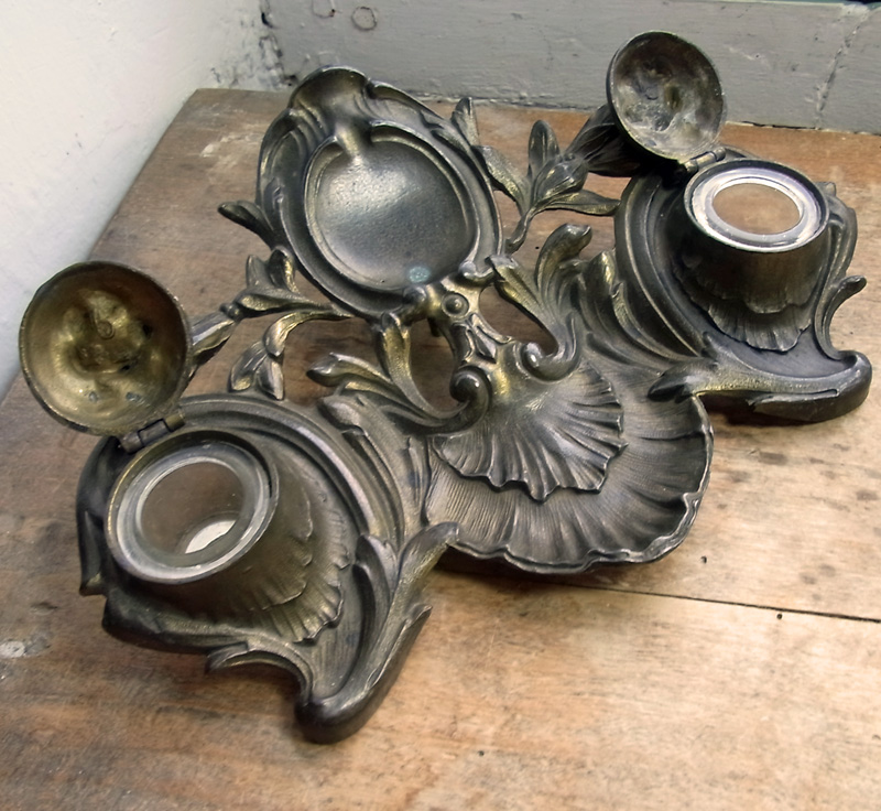 100年ぐらい前の古いペン置き&インク入れ。 デザインはアールヌーボーです。インク入れのガラスの瓶もついています。 ガラスの淵に小さなかけがありますが、きちんと使えます。