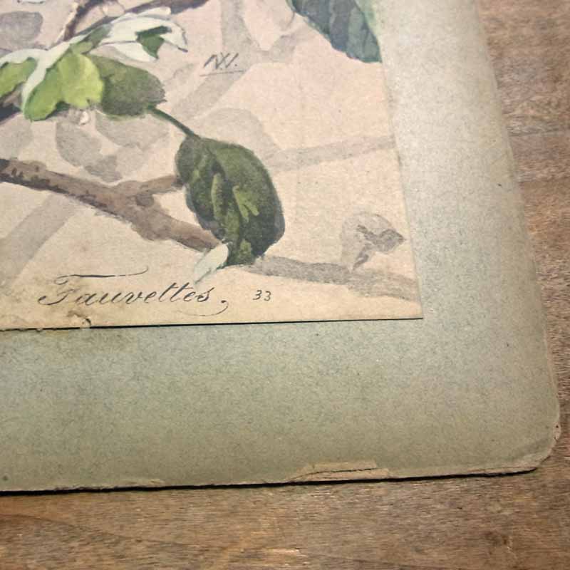 パリの有名な出版人 Armand Guerinet(彼の出版物は博物館、美術館などでも見ることができます)が出した植物&小鳥のプリント画。 とても素敵なモチーフです。 蔵書印があることから、ブルジョア階級以上のご家庭のコレクションだったのだと思います。 古いものなので紙の切れ、変色があります。